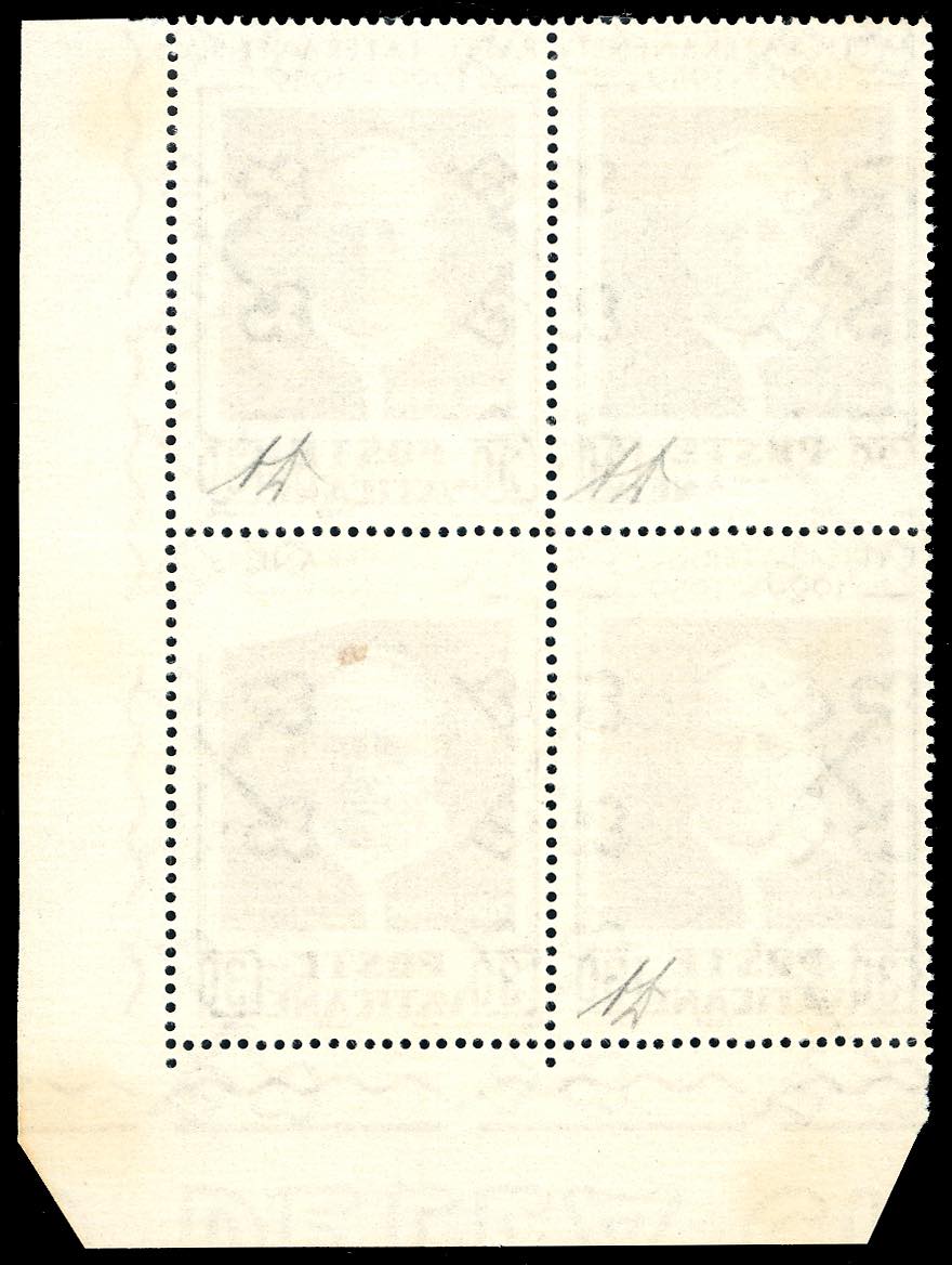 1959 - 30 lire Patti Lateranensi (260), blocco di quattro, tre esemplari con stampa parzialmente mancante, angolo di foglio, gomma originale integra, perfetto. Varietà unica dovuta all'interposizione di un corpo estraneo in fase di stampa e non catalogata. A.Diena, cert. Ferrario.
