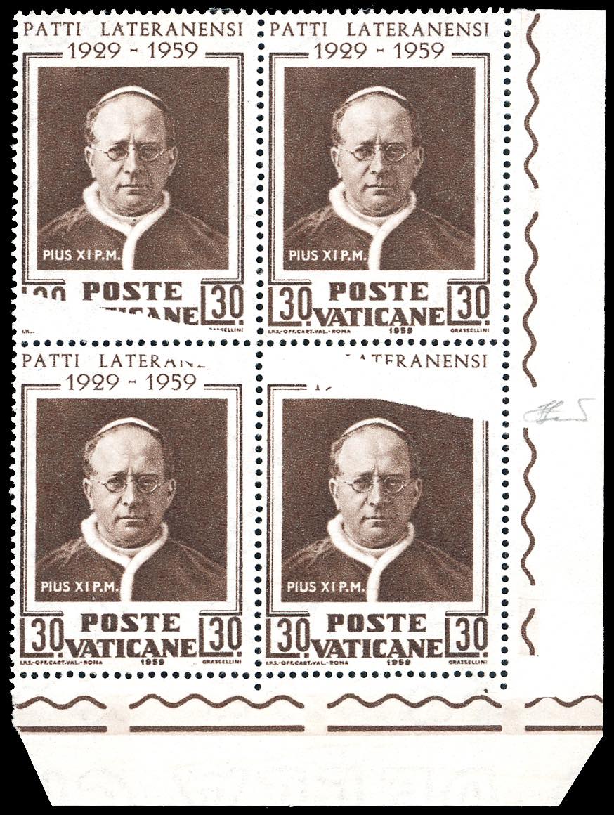 1959 - 30 lire Patti Lateranensi (260), blocco di quattro, tre esemplari con stampa parzialmente mancante, angolo di foglio, gomma ... Leggi tutto