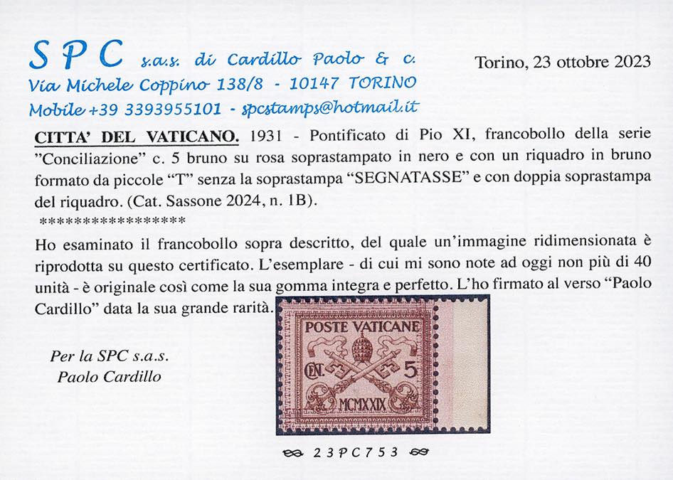 SEGNATASSE 1931 - 5 cent., senza soprastampa "SEGNATASSE" (1B), bordo di foglio, nuovo, gomma originale integra, perfetto e molto fresco. Raro e di ottima qualità. Cardillo e Ferrario.
