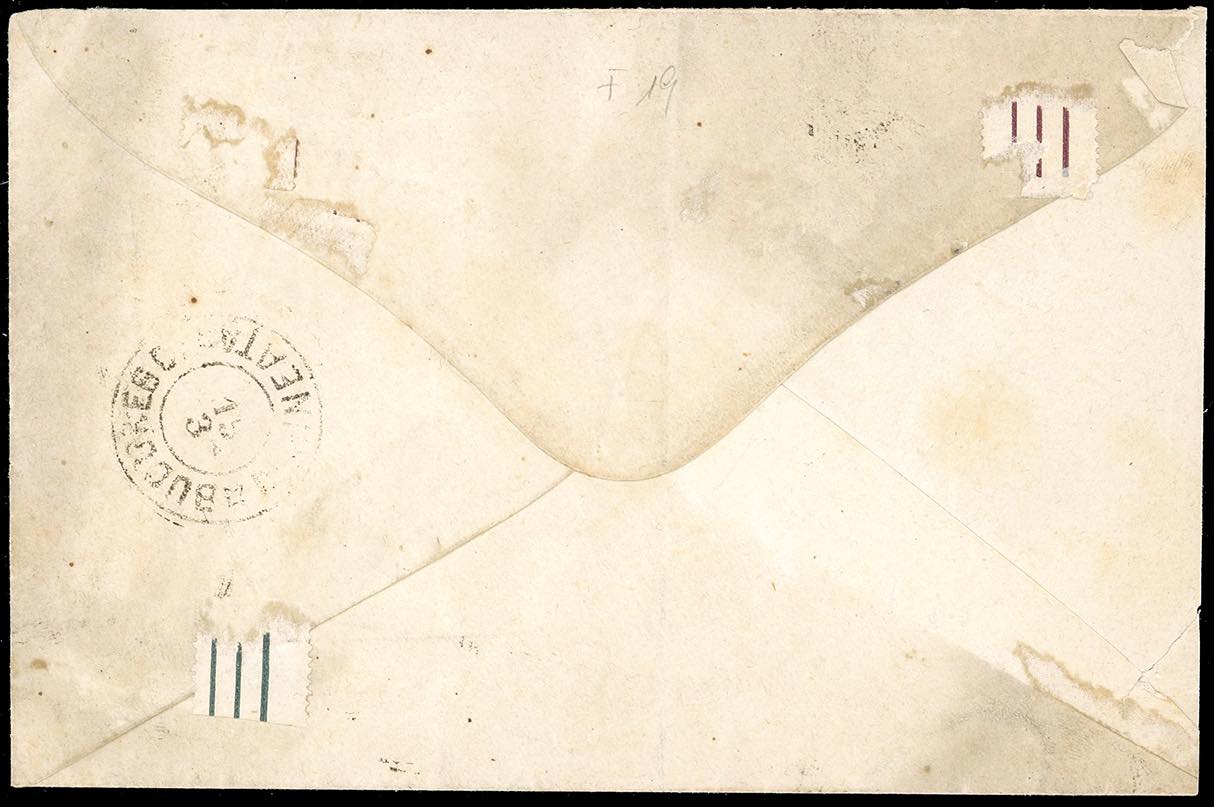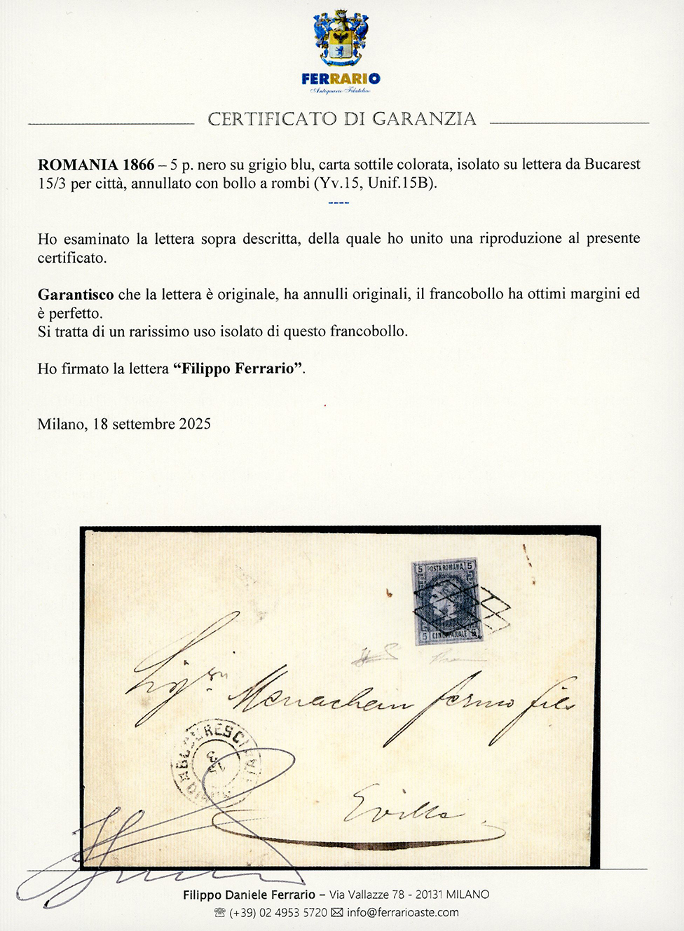 ROMANIA 1866 - 5 p. nero su grigio blu, carta sottile colorata (Yv.15, Mi. 15ya, Unif.15B), perfetto, ottimi margini, isolato su lettera da Bucarest 15/3 per città. Molto bella e rarissimo uso isolato di questo francobollo. Ex collezione Emilio Diena, cert. Diena e Ferrario.