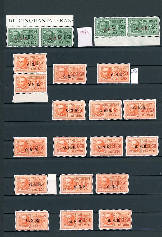REPUBBLICA SOCIALE ITALIANA ESPRESSI 1943 - Soprastampati G.N.R., tiratura di Brescia (19/II-20/III), bella collezione di esemplari con varietà, anche di pregio. Ottima qualità generale, soprastampe garantite. Insieme di difficile reperibilità. Ex collezione Lemano.