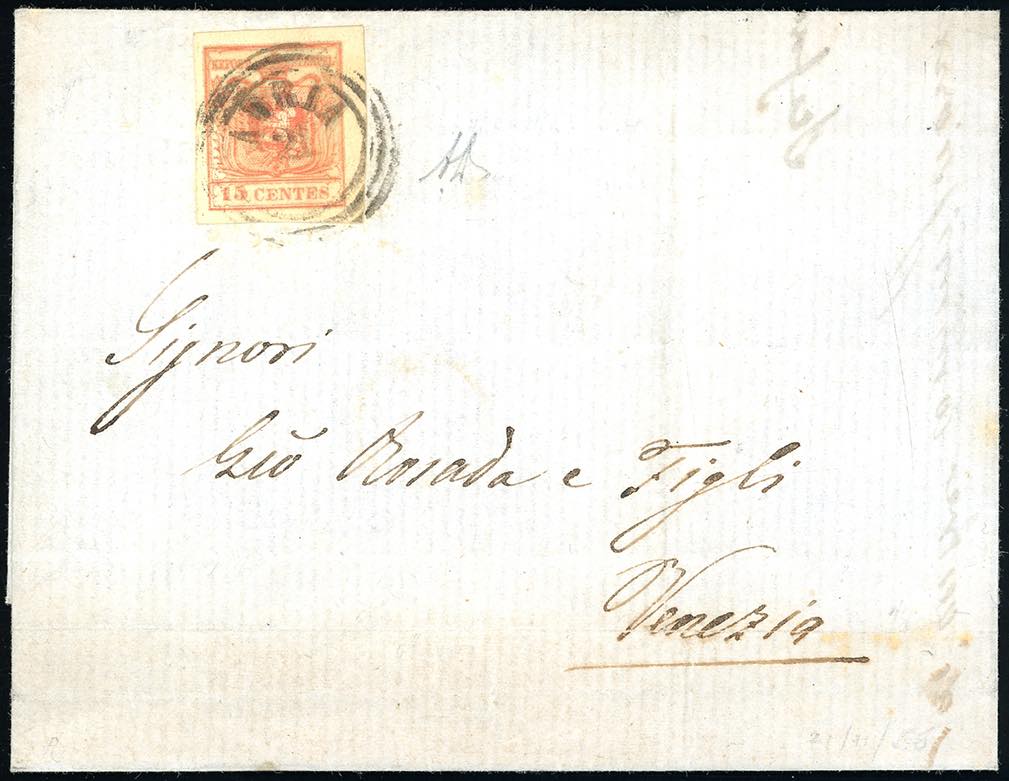 1856 - 15 cent. rosso vermiglio, III tipo, carta a macchina, stampa oleosa, dovuta probabilmente alla gommatura del foglio quando l'inchiostro di stampa non era ancora asciutto (20), perfetto, su lettera da Adria 21/12/1856 a Venezia. Varietà molto rara, per specialista. Dettagliato cert. A.Diena.