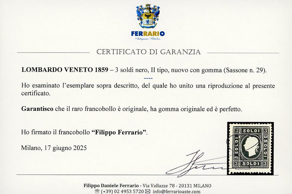 1859 - 3 soldi nero, II tipo (29), nuovo, gomma originale, leggera traccia di linguella, perfetto. Raro e di ottima qualità. Fiecchi, ... Leggi tutto