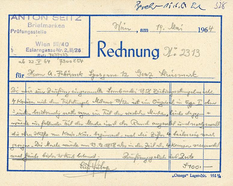 1858 - 4 kr. rosso smorto (4), tre ottimi margini, riparato a sinistra, usato a Milano 13/12/1858, tassello del valore ben visibile. Raro l'uso in Lombardia di questo segnatasse prima del 1°gennaio 1859. Cert. storico Seitz.