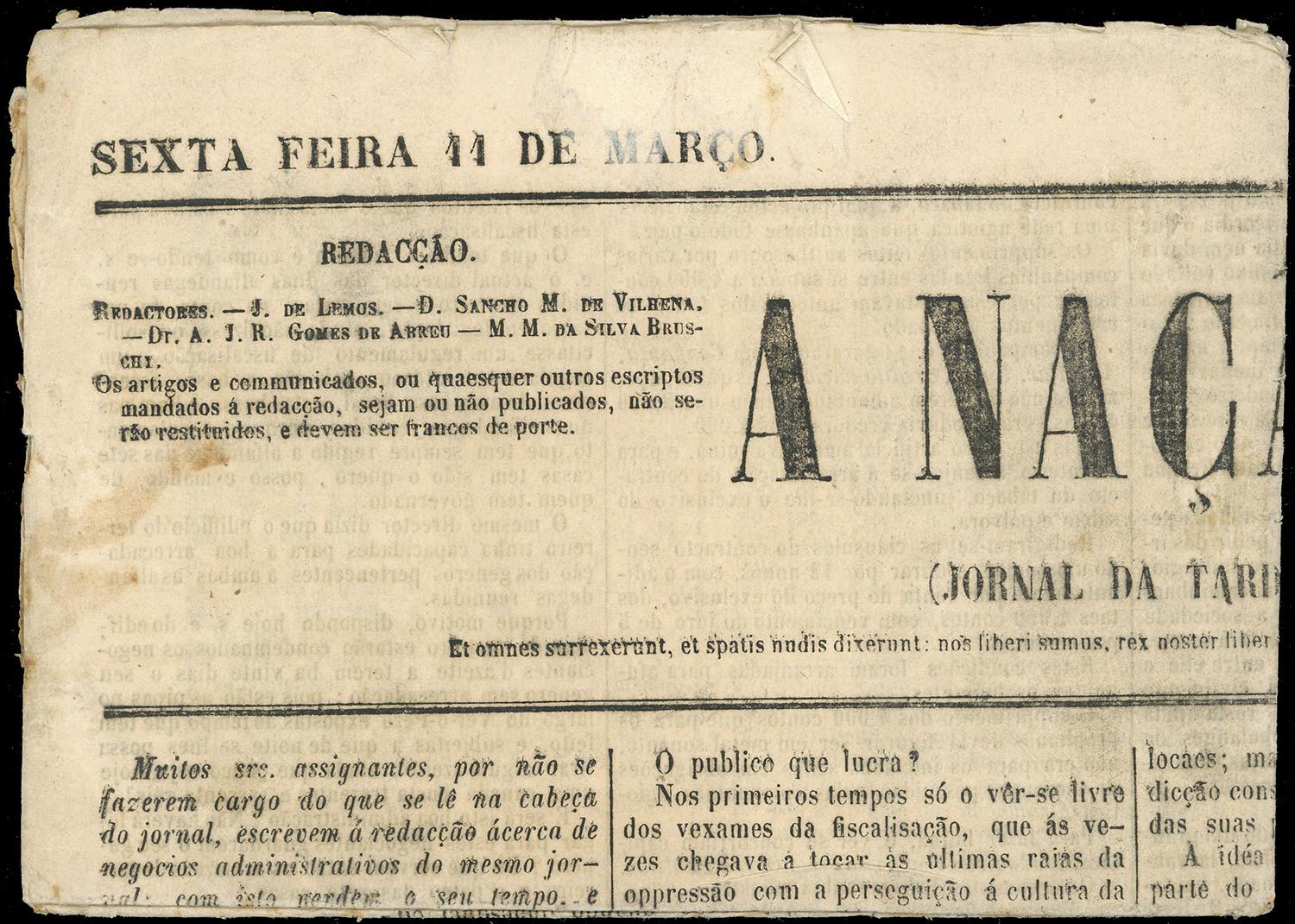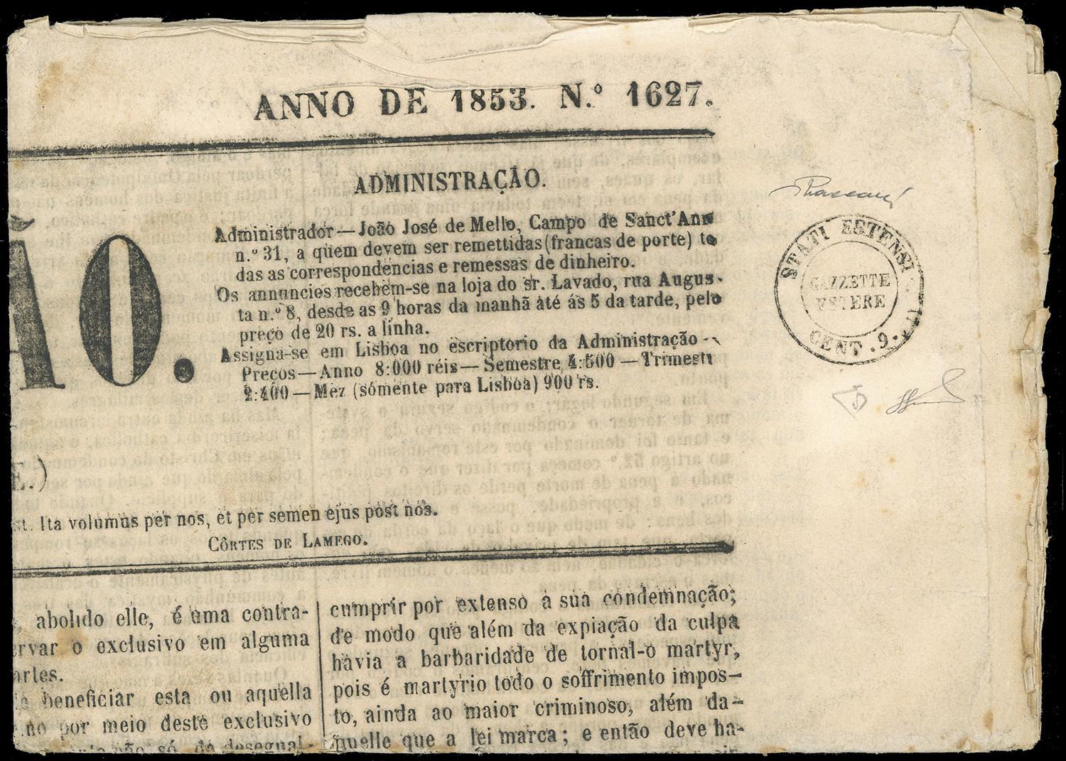 1853 - 9 cent. Gazzette Estere (B1), su giornale completo A Nacao del 11/3/1853 edito a Lisbona, in Portogallo. Eccezionale e rarissima ... Leggi tutto