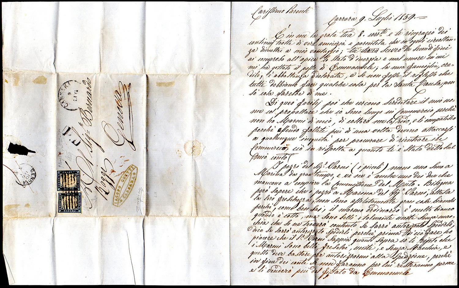 1859 - 20 cent. azzurro scuro (Sardegna 15B), due esemplari, perfetti, su lettera da Carrara 9/7/1859 a Genova. Rara tariffa di doppio ... Leggi tutto
