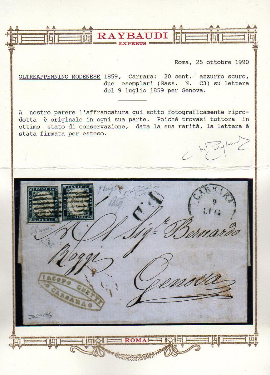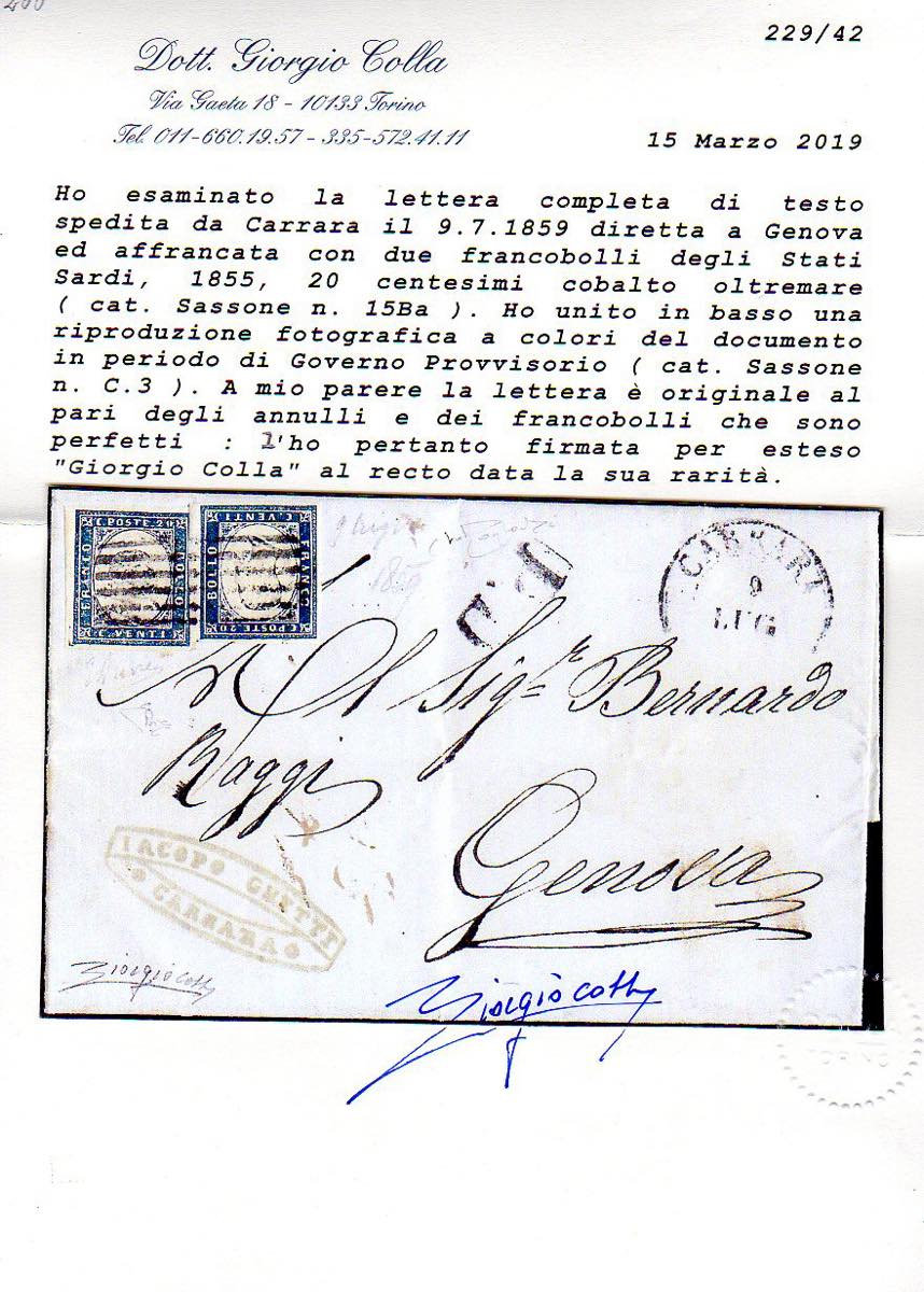 1859 - 20 cent. azzurro scuro (Sardegna 15B), due esemplari, perfetti, su lettera da Carrara 9/7/1859 a Genova. Rara tariffa di doppio porto in periodo di Governo Provvisorio. Emilio ed E.Diena, cert. Colla e Oro Raybaudi.