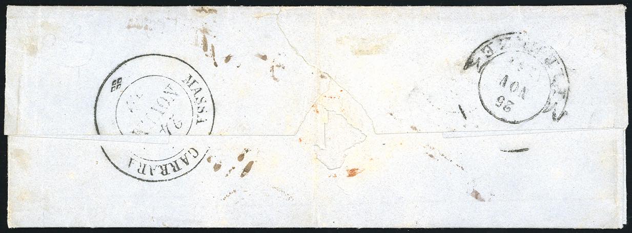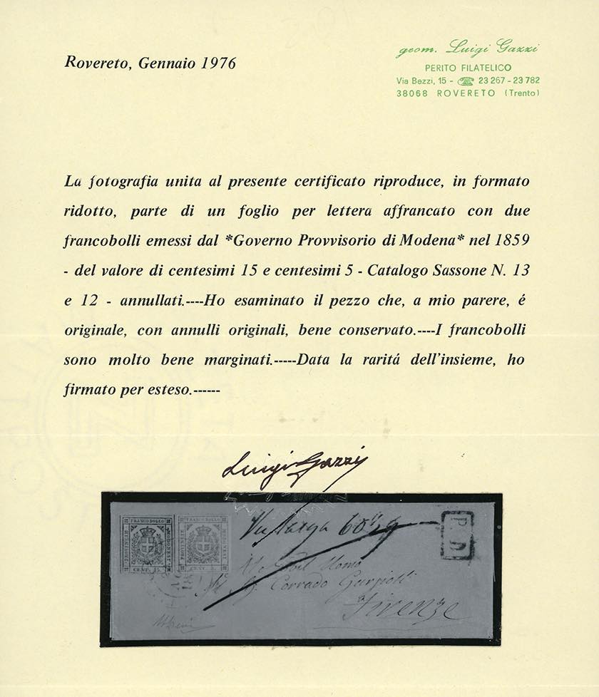 1859 - 15 cent. bruno, 5 cent. verde (13,12), perfetti, su lettera da Fivizzano 23/11/1959 a Firenze. Rara. Cert. A.Diena e Bottacchi.