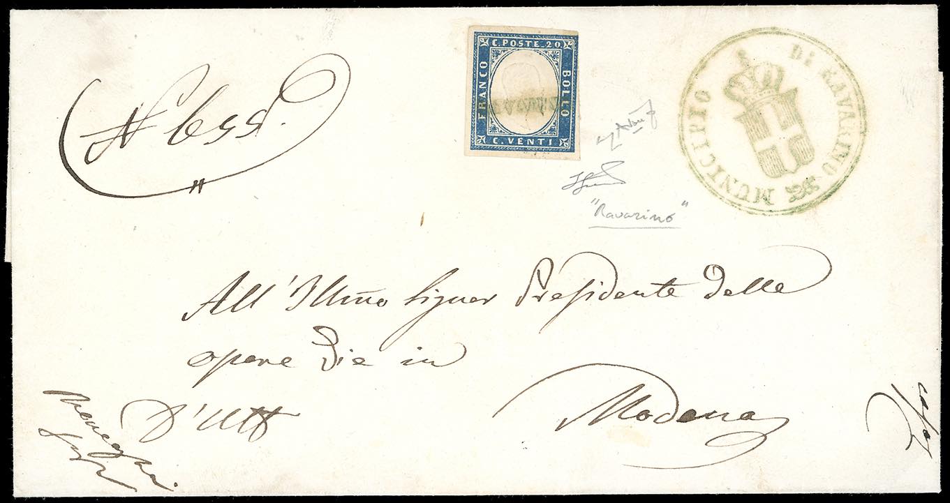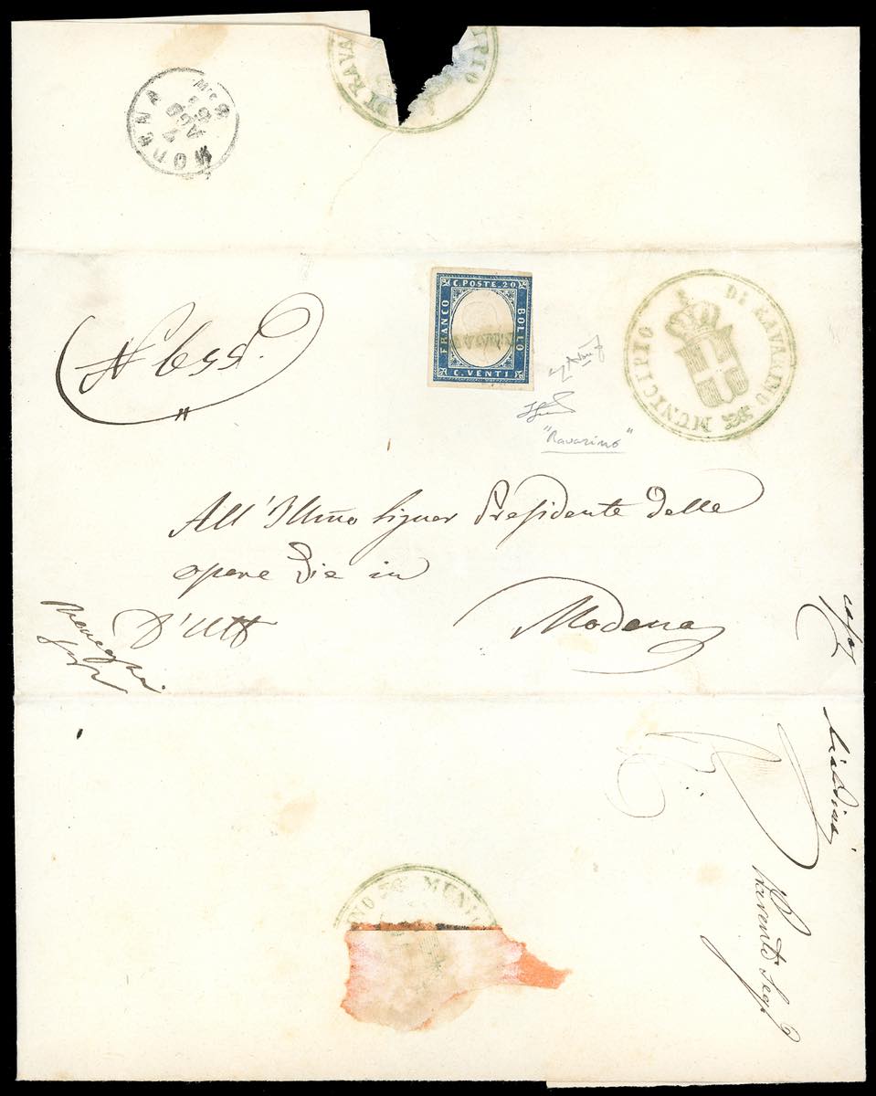 RAVARINO DI MODENA, lineare azzurro verdastro punti R3 - 20 cent. IV emissione di Sardegna (15Dc), perfetto, su fresca lettera per Modena, ... Leggi tutto