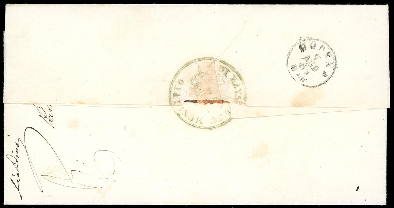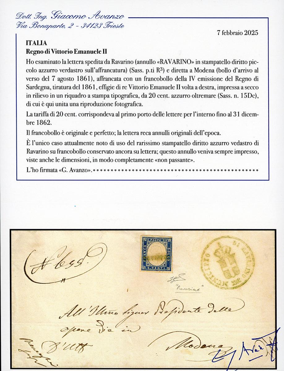 RAVARINO DI MODENA, lineare azzurro verdastro punti R3 - 20 cent. IV emissione di Sardegna (15Dc), perfetto, su fresca lettera per Modena, bollo d'arrivo al verso del 7/8/1861. UNICO CASO NOTO DI QUESTO RARISSIMO ANNULLO SU LETTERA. Rarità del settore, per specialista. Ferrario, cert. Avanzo.