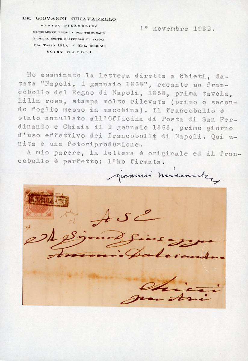 1858 - 2 grana lilla rosa, I tavola (5b), perfetto, su lettera da Napoli S.Ferdinando a Chiaia 2/1/1858, PRIMO GIORNO D'EMISSIONE, a Chieti. Secondo il perito Chiavarello, profondo conoscitore dei francobolli di Napoli, la stampa "molto rilevata" indicherebbe il "primo o secondo foglio messo in macchina"! Molto rara e probabilmente unica con tale tinta, per specialista. Cert. Chiavarello. Una delle gemme della collezione Imperato. (cat.Sassone € 400.000+).