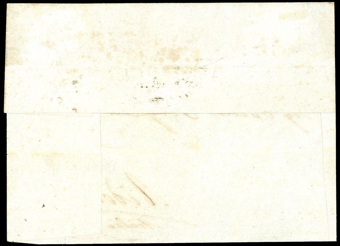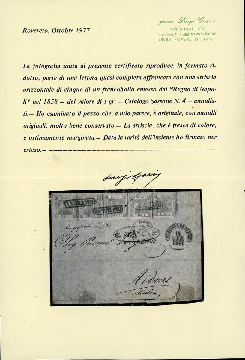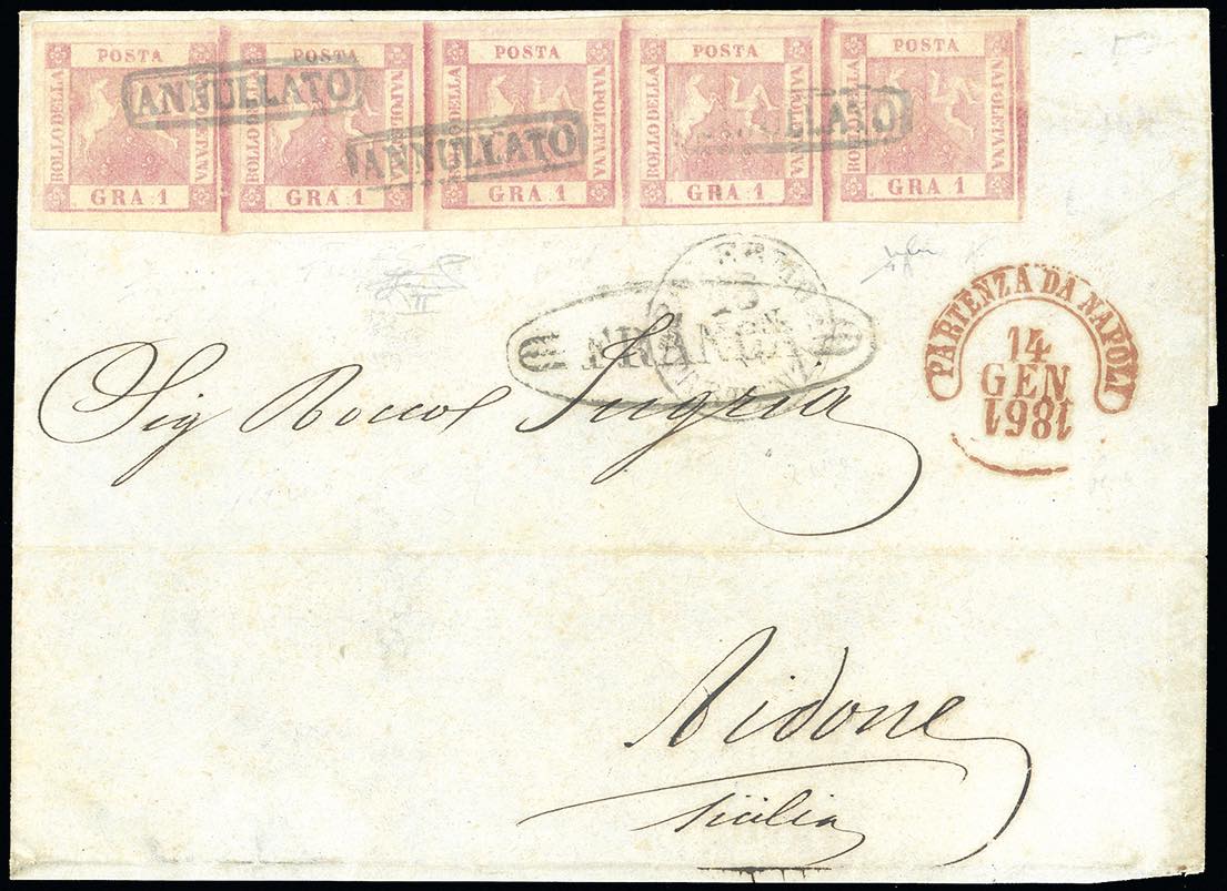 1861 - 1 grano rosa carminio, II tavola (4), striscia orizzontale di 5, filigrana capovolta, perfetta e di eccezionale freschezza, su lettera, incompleta al verso da Napoli 14/1/1861 (anno capovolto), ad Aidone, in Sicilia, bollo ovale "franca" e datario "Palermo Partenza" (per errore!), apposto in arrivo. Molto bella. Chiavarello, Ferrario. Ex coll. Imperato.
