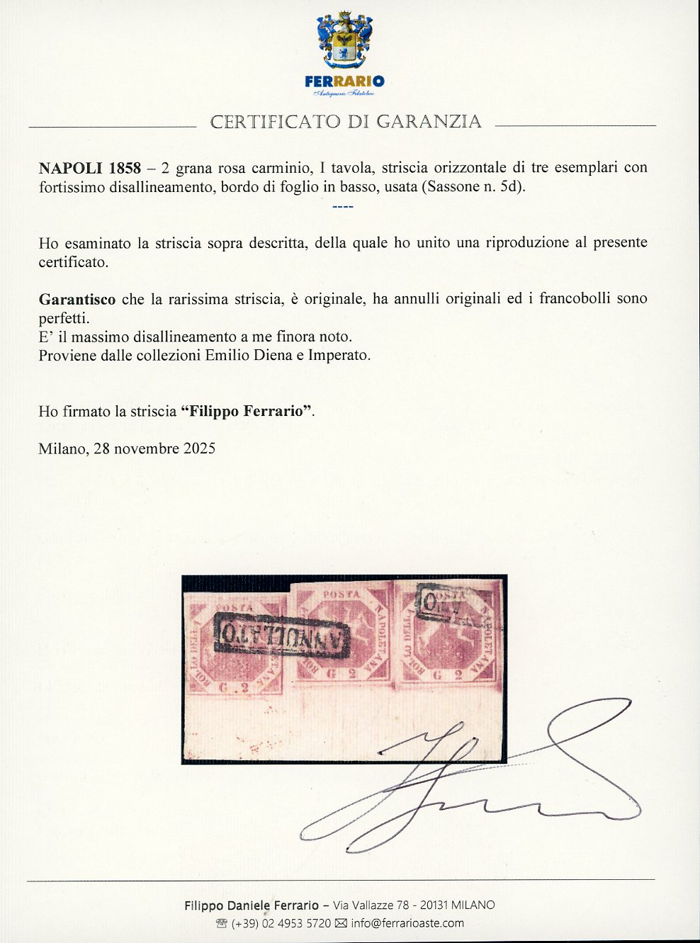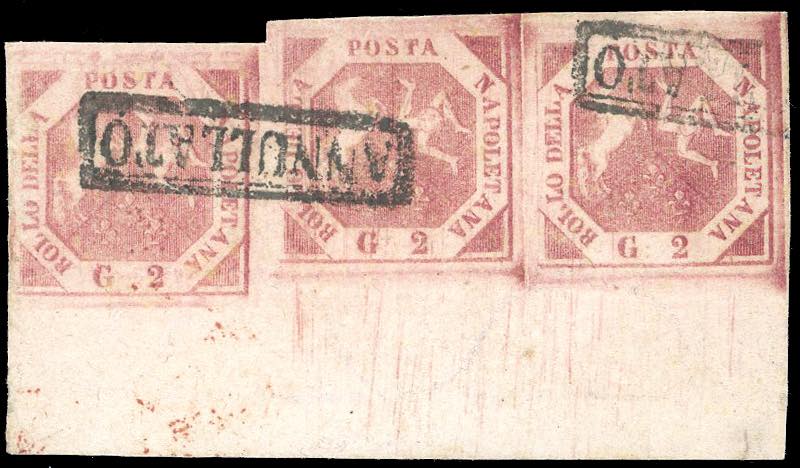 1858 - 2 grana rosa carminio, I tavola (5d), striscia orizzontale di tre esemplari con spettacolare disallineamento, bordo di foglio in basso, usata, perfetta. Splendida e rarissima così evidente, da esposizione! Cert. Ferrario. Ex collezione Emilio Diena e Imperato.