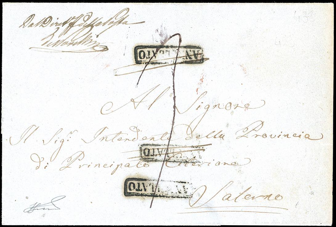 1860 - Lettera in franchigia da Napoli 21/6/1860 a Salerno, erroneamente tassata 3 grana, successivamente cassati a penna e mediante l'impiego di tre impronte del bollo in cartella "annullato". Interessante. Ferrario.