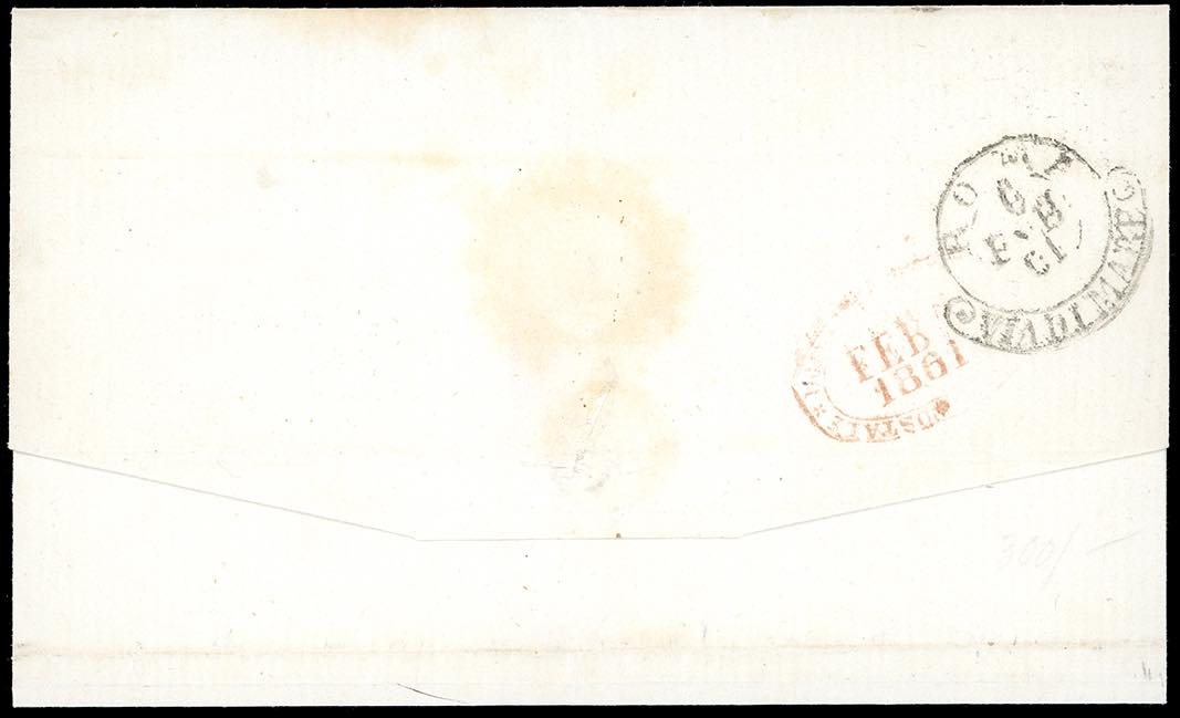 1861 - 10 grana rosa carminio, II tavola (11), perfetto, margini grandiosi, isolato su fresca lettera da Napoli a Roma, al verso bollo speciale "Roma via di mare 6 Feb.61", bollo di transito al recto "Civitavecchia dalla via di mare". Molto bella e rara. A.Diena, Raybaudi.