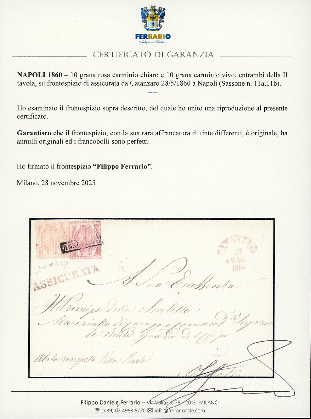 1860 - 10 grana rosa carminio chiaro e 10 grana carminio vivo, entrambi della II tavola (11a,11b), perfetti, su fresco frontespizio di assicurata da Catanzaro 28/5/1860 a Napoli. Insieme splendido e combinazione del tutto eccezionale, probabilmente unica. Chiavarello, Enzo Diena, cert. Ferrario.