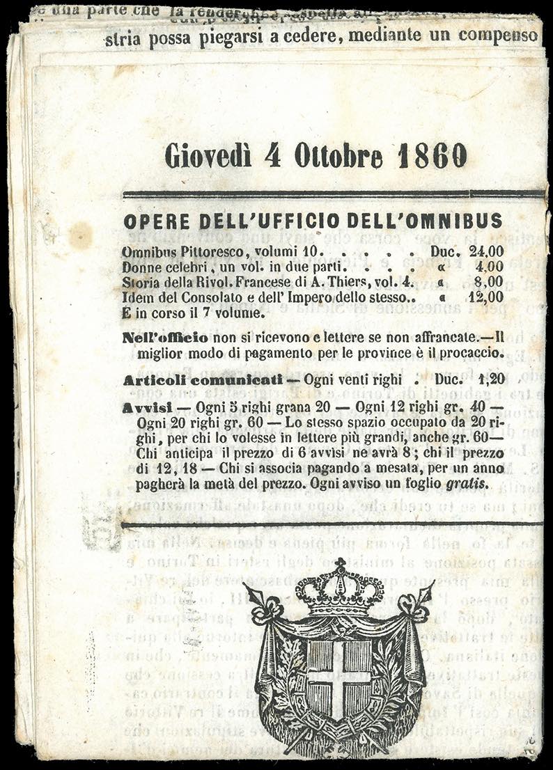 1860 - 1/2 grano rosa, II tavola, carta crema (2c), perfetto e ben marginato, isolato su giornale completo "L'OMNIBUS" del 4/10/1860, con ... Leggi tutto