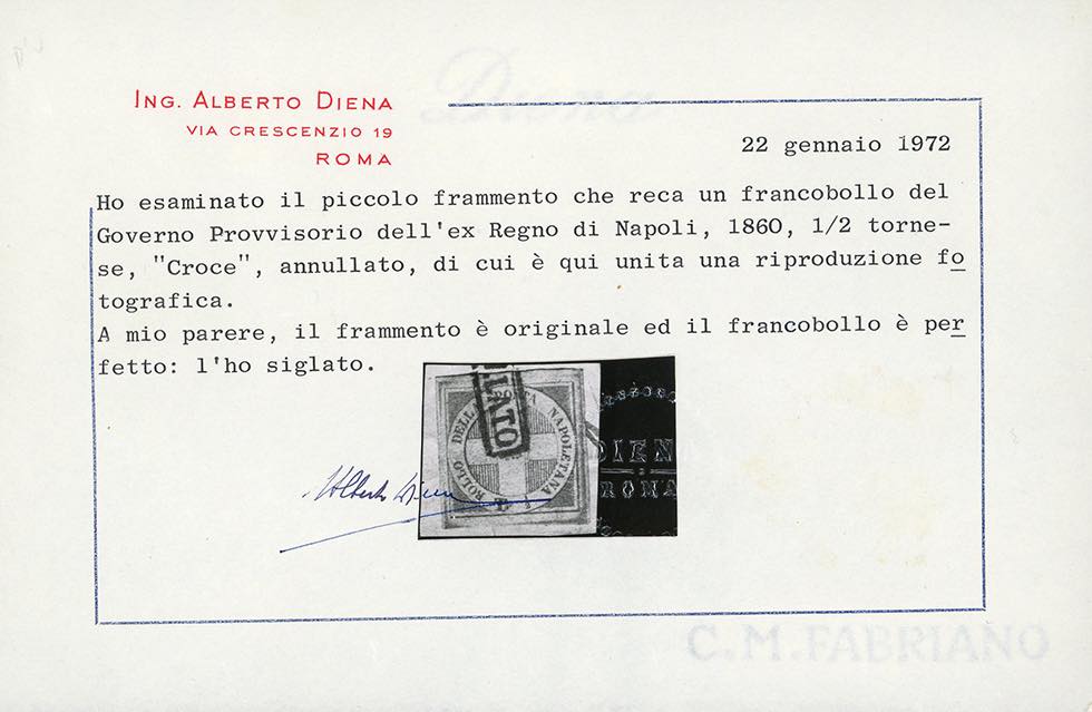 1860 - 1/2 tornese azzurro Crocetta (16), perfetto, usato, su piccolo frammento. Molto bello. Cert. A.Diena e Ferrario.
