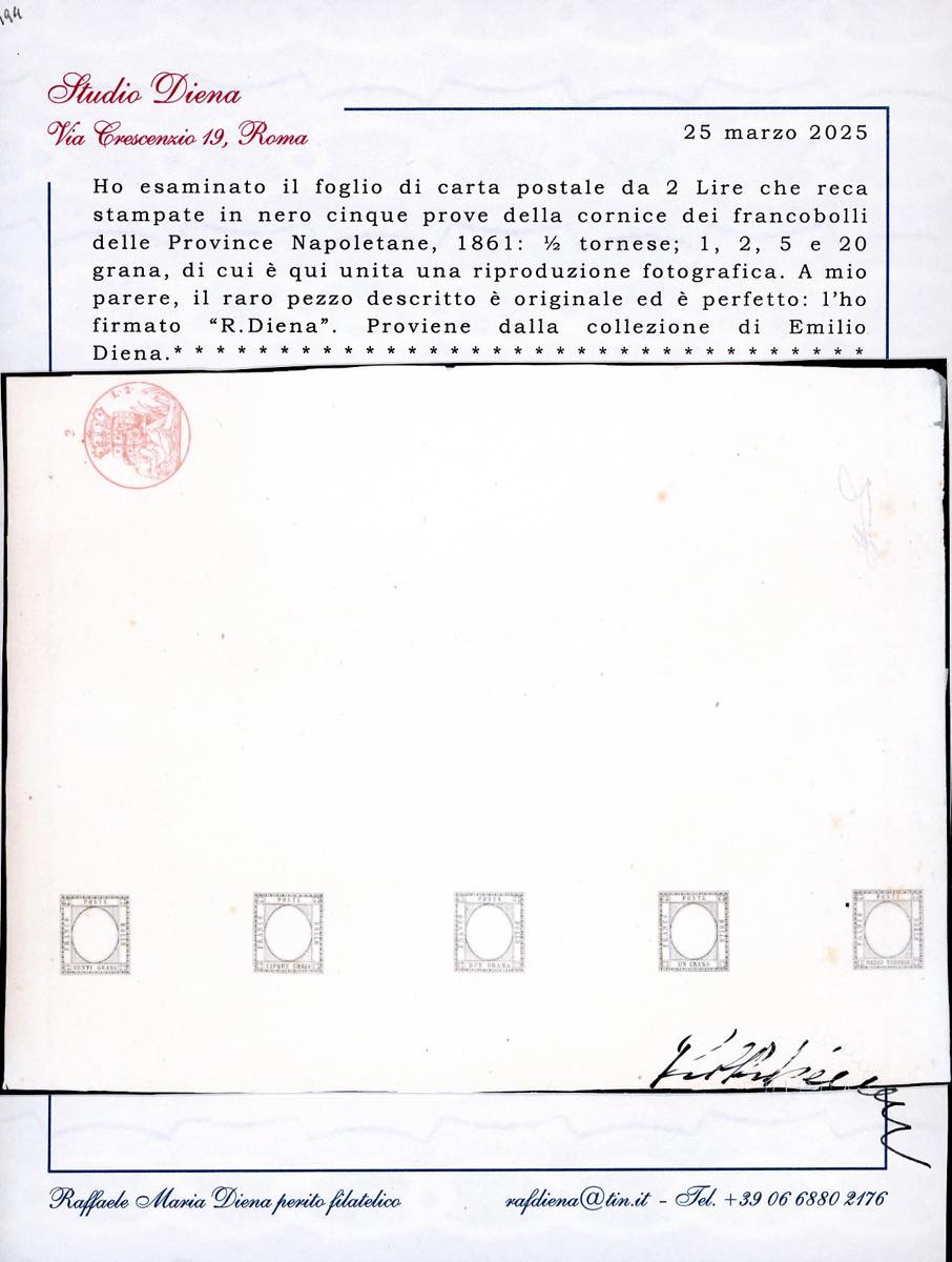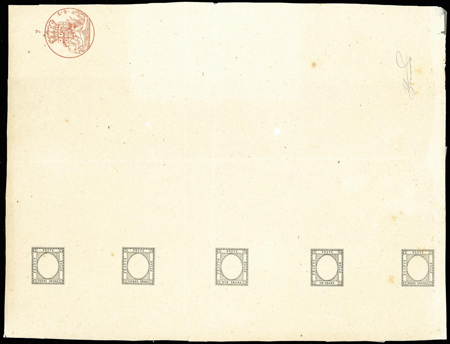 1861 - Prove della pietra in nero con indicazione del valore, cinque esemplari su foglio di carta bollata da lire 2, cm. 19,5 x 25,5, dei francobolli da 1/2 tornese, 1 grano, 2 grana, 5 grana e 20 grana, senza effigie, senza gomma, perfette. Insieme probabilmente unico. Ferrario. Cert. Diena. Ex coll. Emilio Diena.