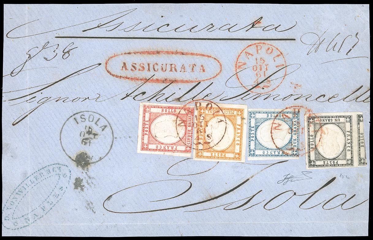 1861 - 1 grano nero, 2 grana azzurro chiaro, 5 grana rosso carminio, 10 grana arancio (19,20,21,22), perfetti ad eccezione del 5 grana leggermente intaccato in basso, molto freschi, su frontespizio di lettera assicurata da Napoli 15/10/1861 ad Isola, bollo di arrivo sul fronte. Affrancatura quadricolore molto rara, di ottimo aspetto. Affrancatura quotata dal Sassone solo su frammento € 24.000. Cert. Ferrario. Ex coll. Imperato.