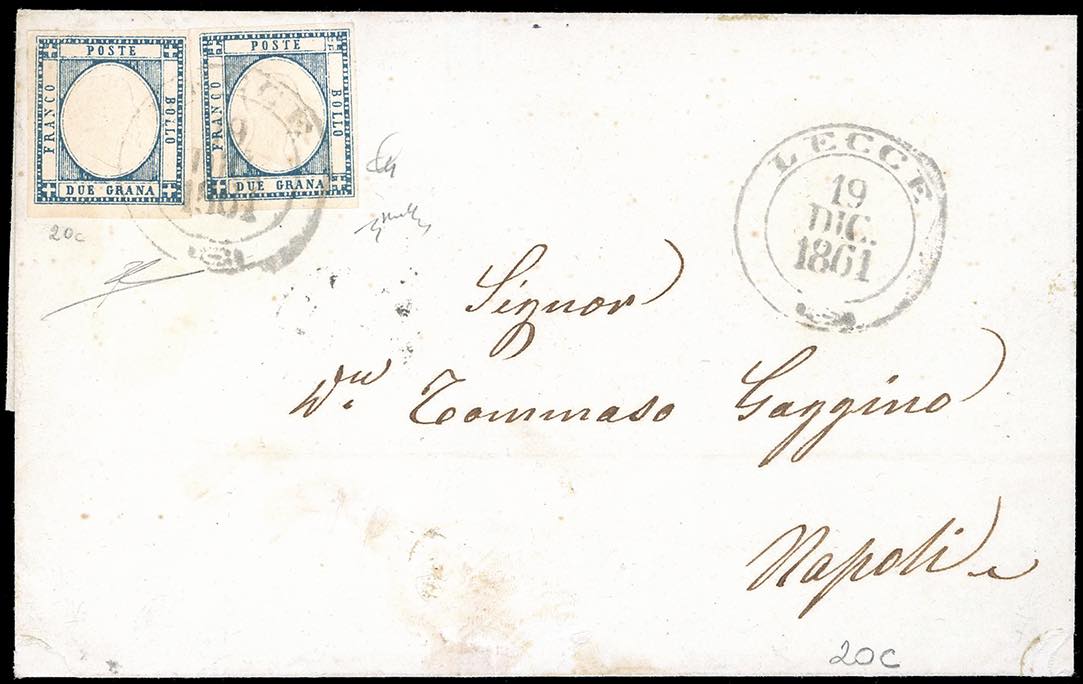 1861 - 2 grana azzurro ardesia (20c), due esemplari, perfetti e ben marginati, su lettera da Lecce 19/12/1861 a Napoli. Chiavarello, cert. Diena.