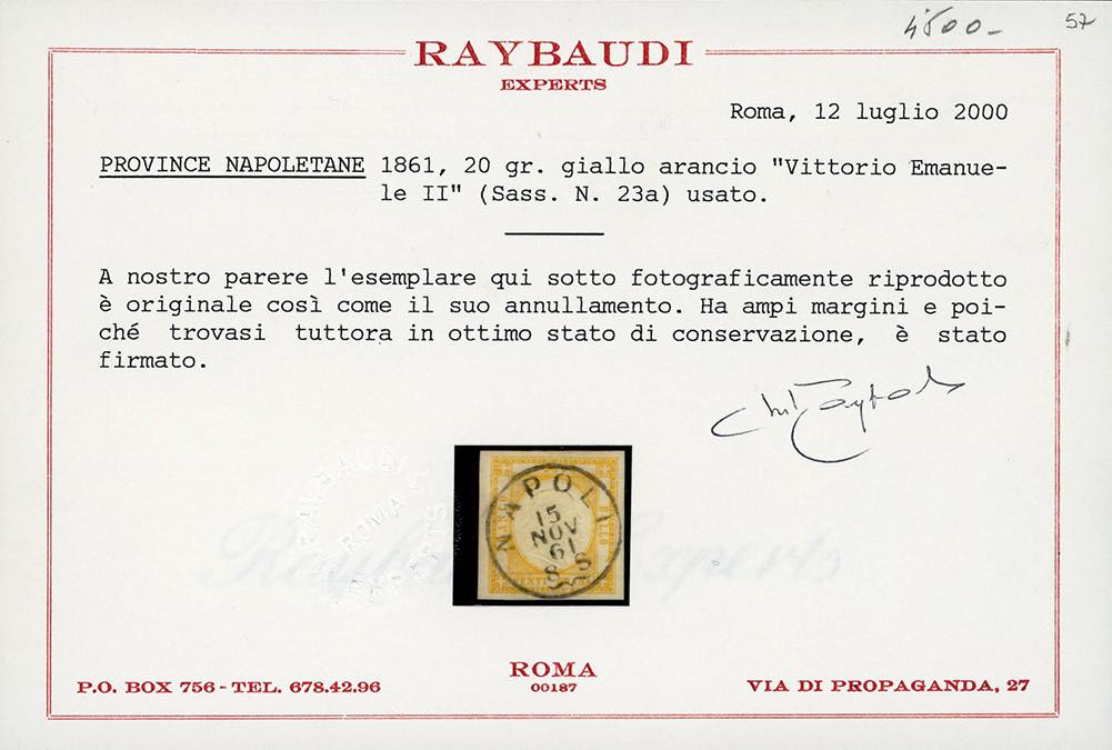 1861 - 20 grana giallo arancio (23), usato con nitido annullo Napoli 15/11/1861 in posizione ideale, perfetto, ampi margini su tutti i lati e molto fresco. Splendido. A.Diena, Russo, cert. Raybaudi.