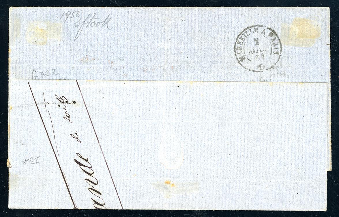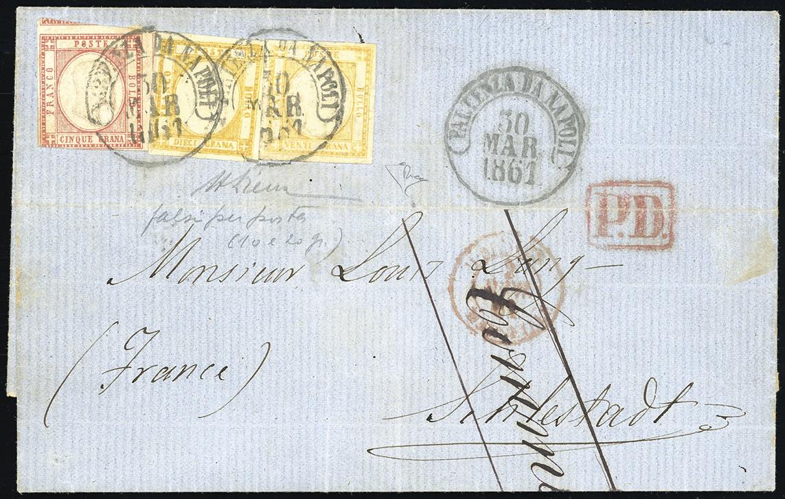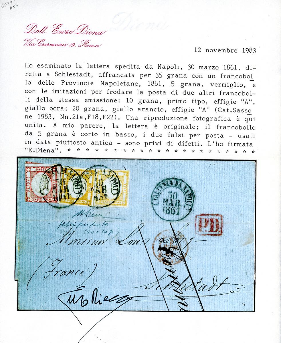 1861 - Falsi per posta: 20 grana giallo arancio, effigie A, 10 grana giallo ocra, I tipo, effigie A, entrambi perfetti e ben marginati, con 5 grana vermiglio (F9,F5,21a), su lettera da Napoli 30/3/1861 a Schlestadt, Francia. Eccezionale e rarissima combinazione di due falsi per posta spedita all'estero. Lettera esposta alla mostra "Dagli Antichi Stati all'Unità d'Italia" tenutasi a Montecitorio nel 1999. Per grande collezione. Alberto Diena e cert. Enzo Diena. Ex coll. Imperato.