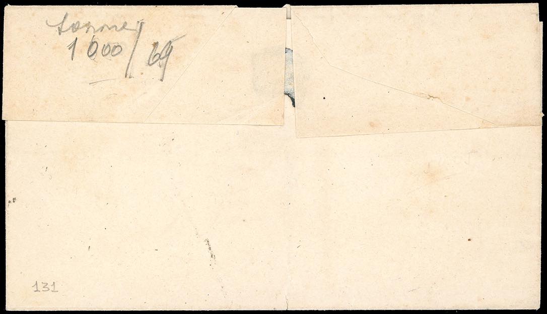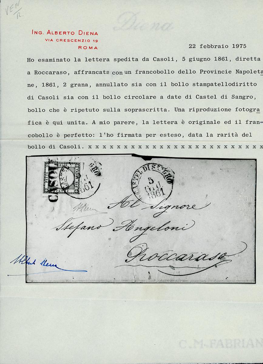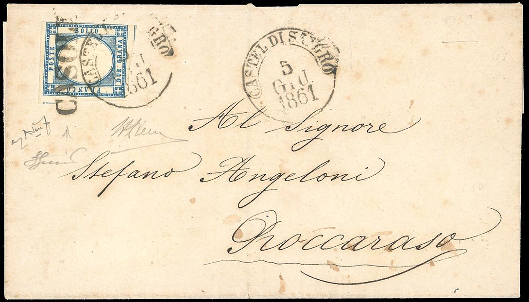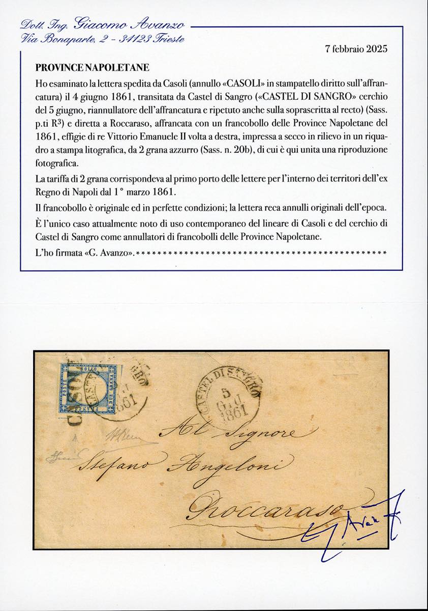 CASOLI, lineare + cerchio di Castel di Sangro coannulatoti punti R3 - 2 grana (20B), perfetto, su lettera del 5/6/1861 per Roccaraso. UNICA COMBINAZIONE NOTA di questi due annulli sui francobolli delle Province Napoletane. Rarità del settore. Ferrario, cert. A.Diena ed Avanzo.