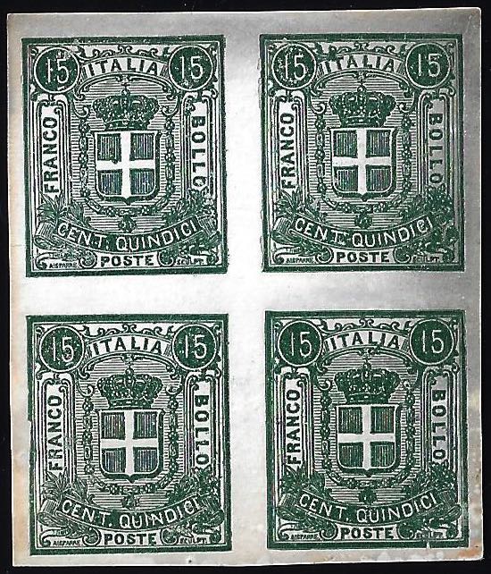 Lotto 1368 - 1863 - 15 cent. verde, saggio Sparre in blocco di quattro ...