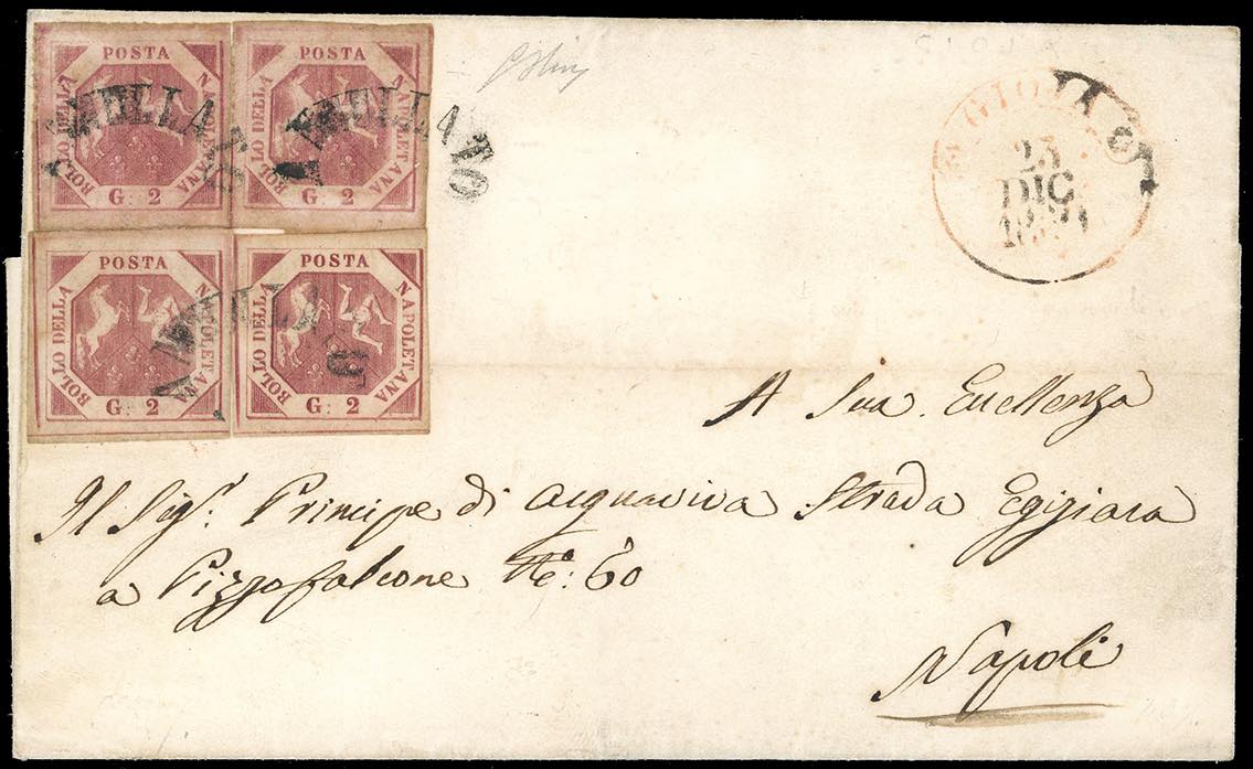 GIOJA, svolazzo tipo 1 + cerchio rosso punti 13 - 2 grana (7d), quattro esemplari, i due inferiori di tonalità diversa, con minima piega, su lettera del 23/12/1860 per Napoli. Ottimo aspetto. G.Oliva.