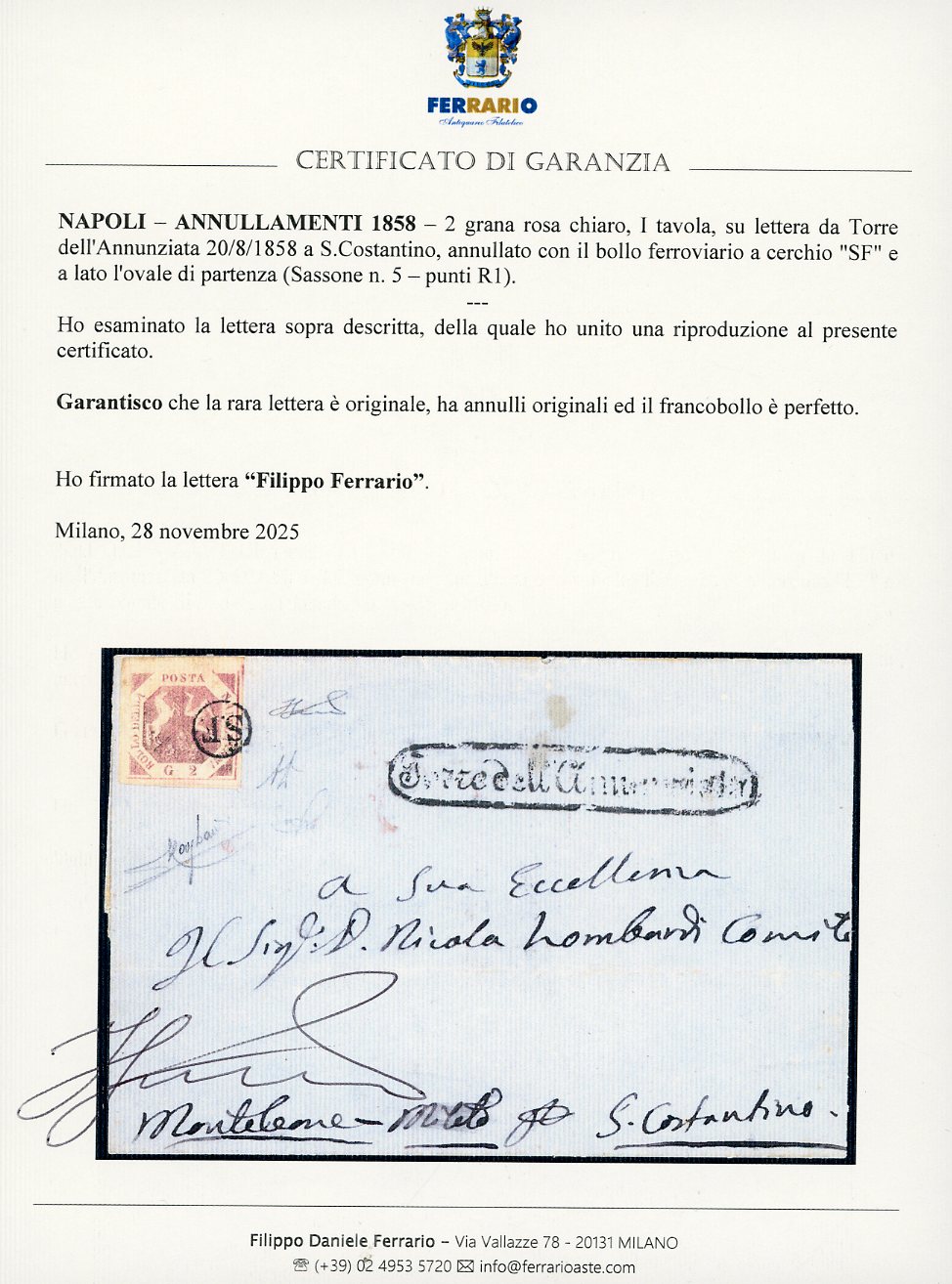 1858 - 2 grana rosa chiaro, I tavola (5), perfetto, su lettera da Torre dell'Annunziata 20/8/1858 a S.Costantino, francobollo annullato con il bollo ferroviario a cerchio "SF" e a lato l'ovale di partenza (punti R1). Molto rara e di ottima qualità. A.Diena, Raybaudi, cert. Ferrario.