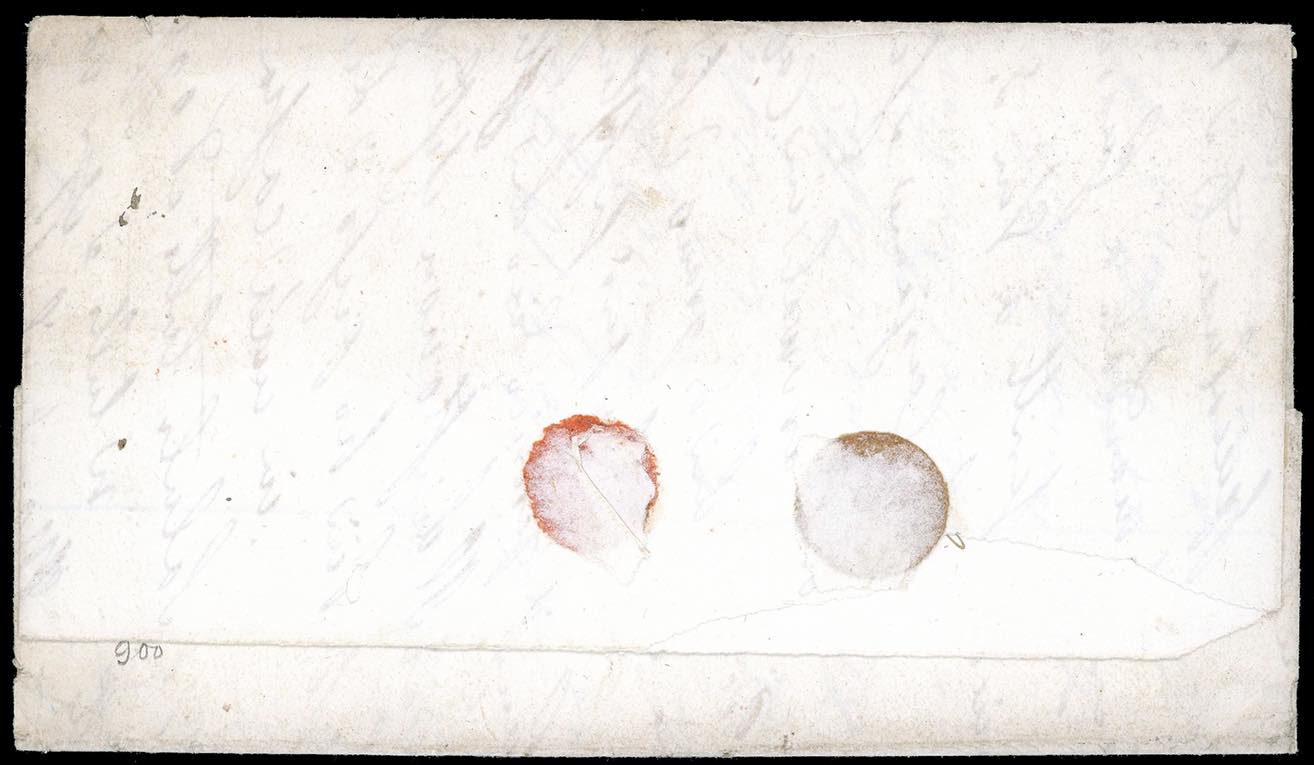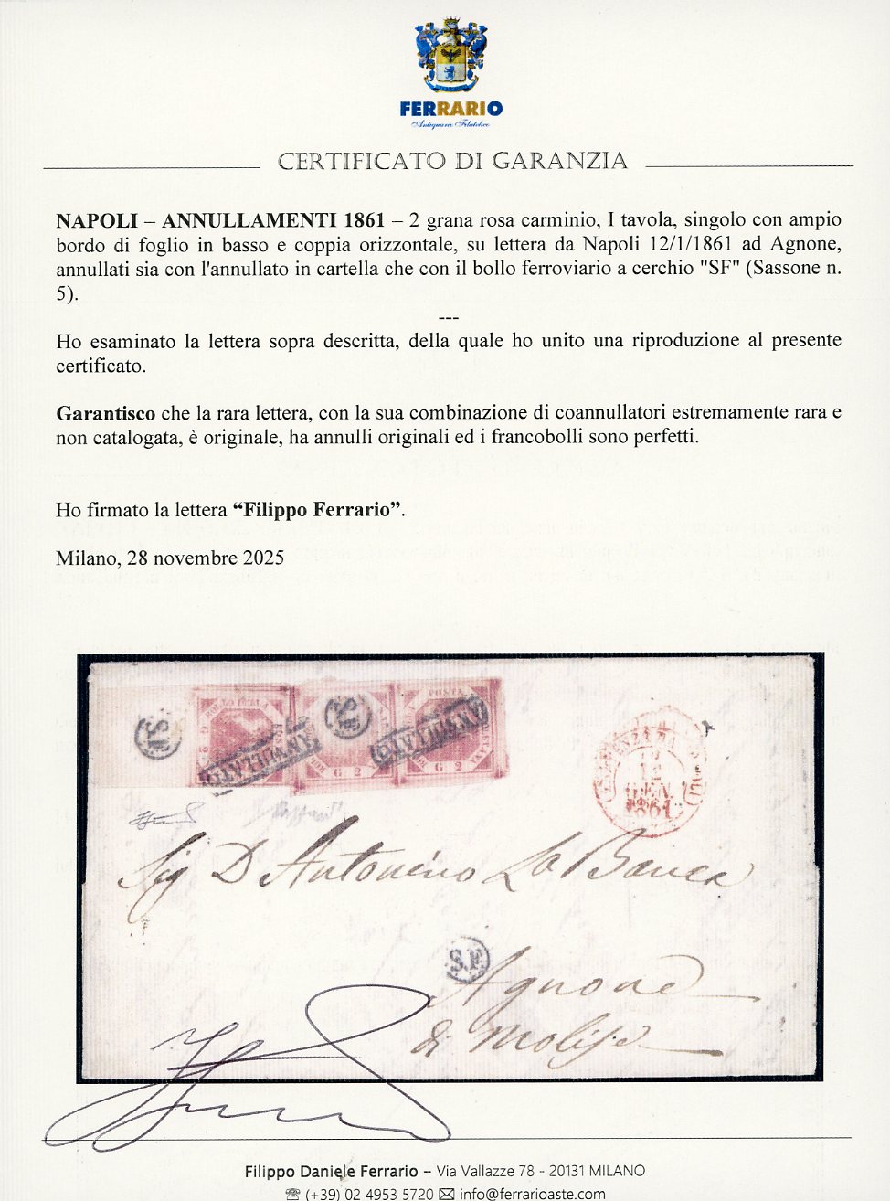 1861 - 2 grana rosa carminio , I tavola (5d), singolo, ampio bordo di foglio in basso e coppia orizzontale, perfetti, su fresca lettera da Napoli 12/1/1861 ad Agnone, ad annullare i francobolli sia l'annullato in cartella che il bollo ferroviario a cerchio "SF". Combinazione di coannullatori estremamente rara e non catalogata, impreziosita dall'affrancatura. Caffaz, cert. Ferrario.