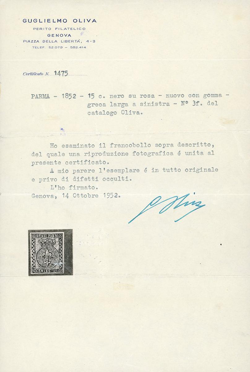 1852 - 15 cent. rosa, greca larga a sinistra (3b), nuovo, gomma originale, perfetto, grandi margini. Raro e di ottima qualità. Cert. G.Oliva e Raybaudi.