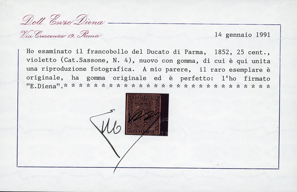 1852 - 25 cent. violetto (4), nuovo, gomma originale, ottimi margini. Presenta un impercettibile piccolo "foro di spillo". Ottimo aspetto. Molto raro. Cert. E.Diena, che lo indica come perfetto.