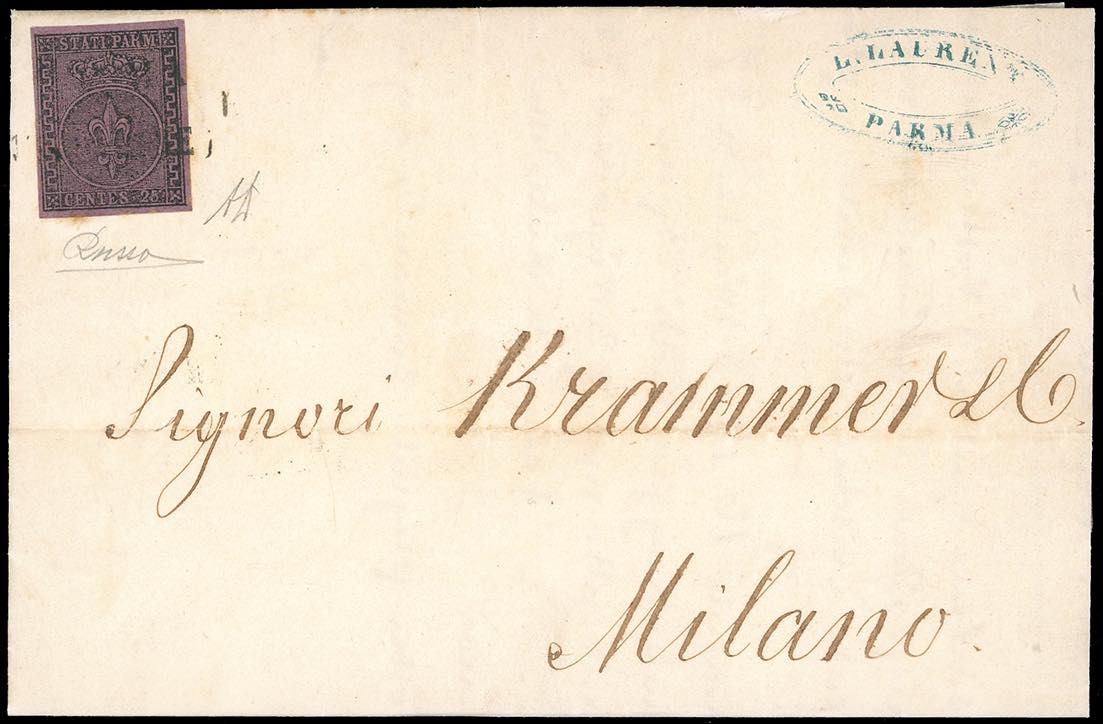 1854 - 25 cent. violetto (4), perfetto e ben marginato, su fresca lettera da Parma 3/11/1854 a Milano. Ottima qualità. A.Diena, Russo.