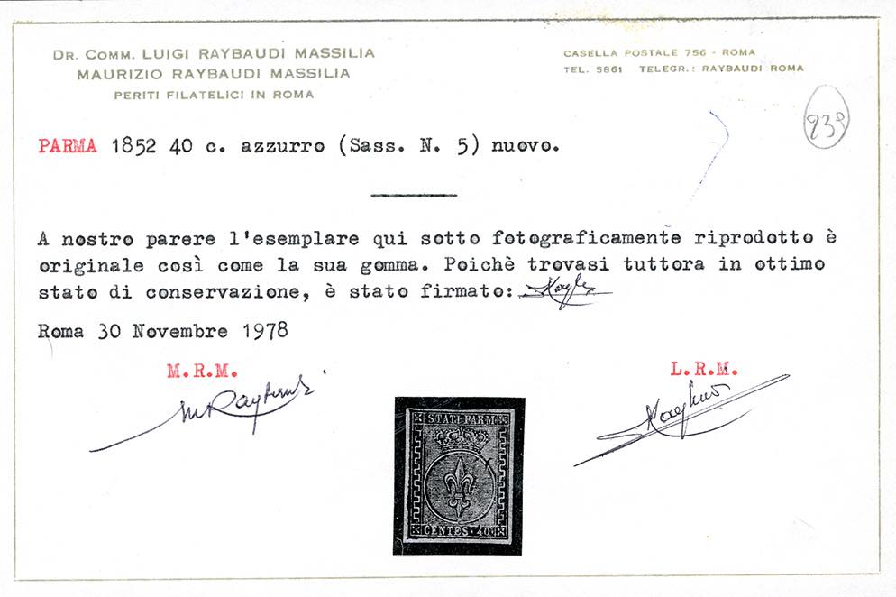 1852 - 40 cent. azzurro (5), gomma originale, perfetto e ben marginato. Perfetto e di ottima qualità. A. ed E.Diena, cert. Raybaudi.