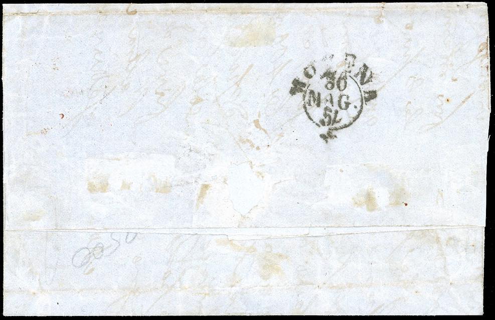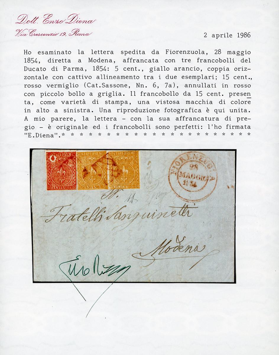 1854 - 5 cent. giallo arancio, coppia orizzontale con forte disallineamento tra i due esemplari, 15 cent. rosso vermiglio, esemplare con evidente ed importante varietà di stampa in alto a sinistra (6,7a), perfetti, su fresca lettera da Fiorenzuola 28/5/1854 a Modena. Rara e bellissima. G.Oliva, Em. ed A.Diena, cert. E.Diena.