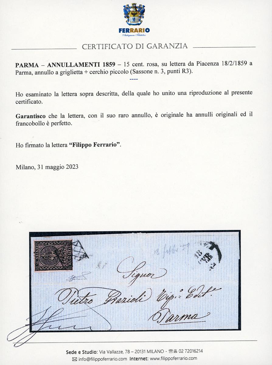 PIACENZA, griglietta + cerchio piccolo punti R3 - 15 cent. rosa (3), perfetto, su fresca lettera del 18/2/1859 a Parma. Rarità degli annulli del Ducato. Ottima qualità, due lettere esistenti. Cert. Ferrario.