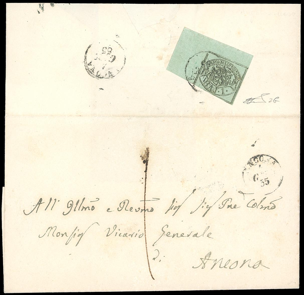 1855 - 1 baj verde grigiastro, stampa con inchiostro grigio oleoso (2b), angolo di foglio, perfetto, al verso di lettera di porto assegnato da Ancona 4/1/1855 per città. Ferrario.