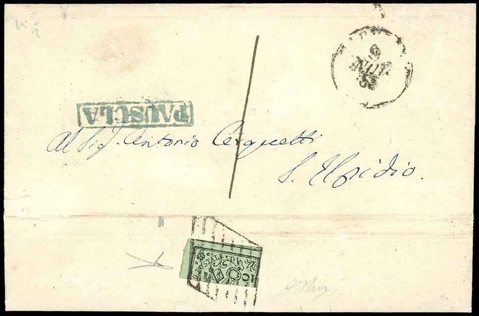 1855 - 2 baj verde oliva (3), frazionato verticalmente a metà, al verso di lettera in porto assegnato da Pausula 9/11/1855 a Sant'Elpidio, tassa "1" manoscritta sul fronte. G.Oliva, Bottacchi.