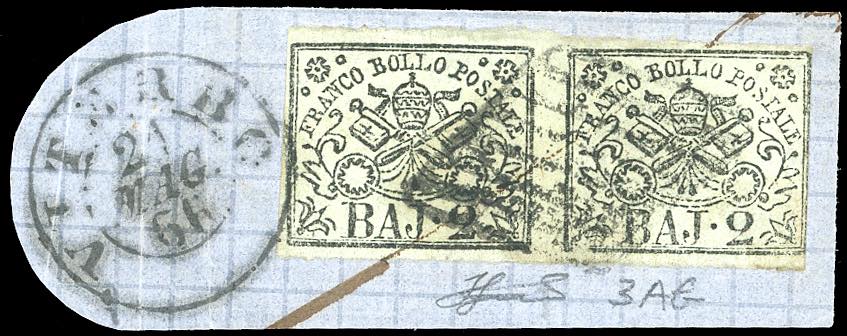 1865 - 2 baj grigio azzurrastro (3Ab), coppia orizzontale con interspazio di gruppo al centro, rasente a destra, usata su frammento a Viterbo 21/5/1866. Rara, pochissimi esemplari noti. Ferrario.