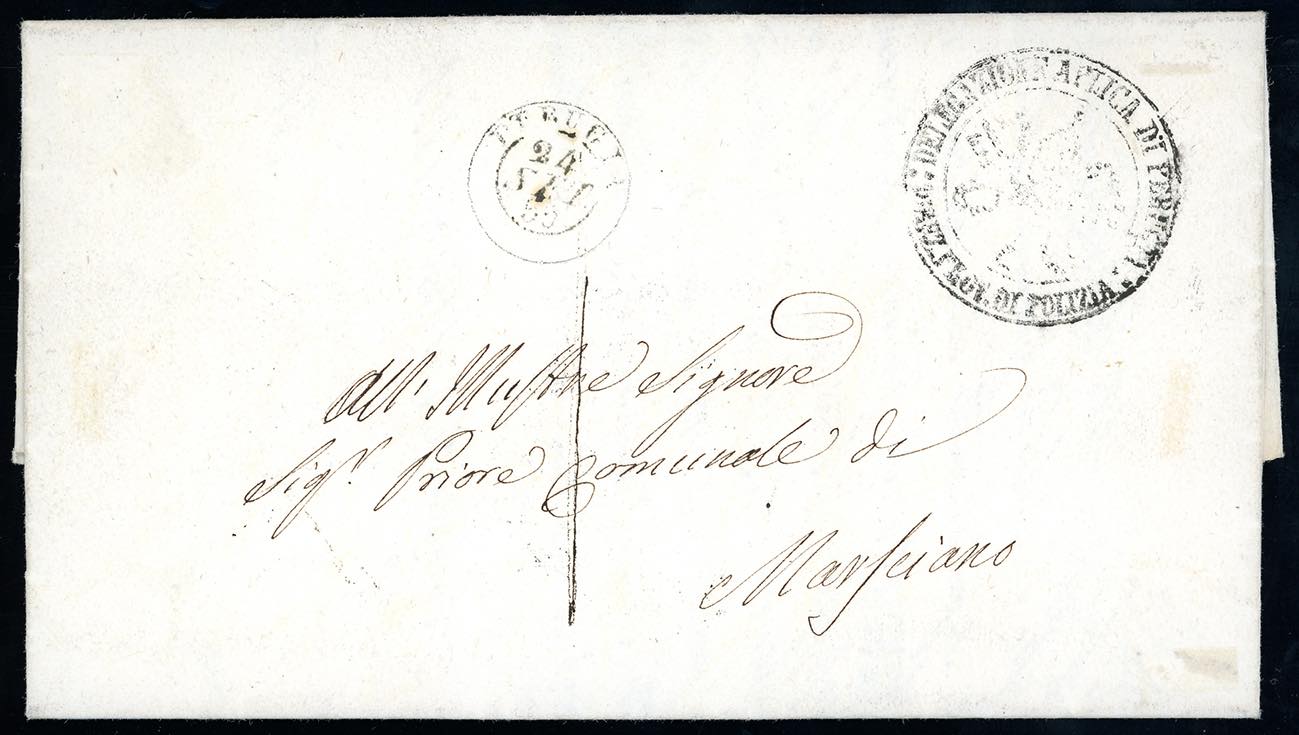 1855 - 3 baj bistro arancio (4), frazionato verticalmente ad 1/3, perfetto e ben marginato, annullato a penna al verso di fresca lettera in porto assegnato da Perugia 24/9/1855 a Marsciano. Molto bella! Cert. A.Diena e Oro Raybaudi.