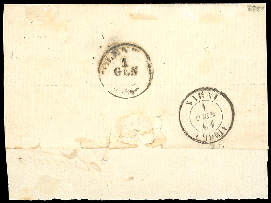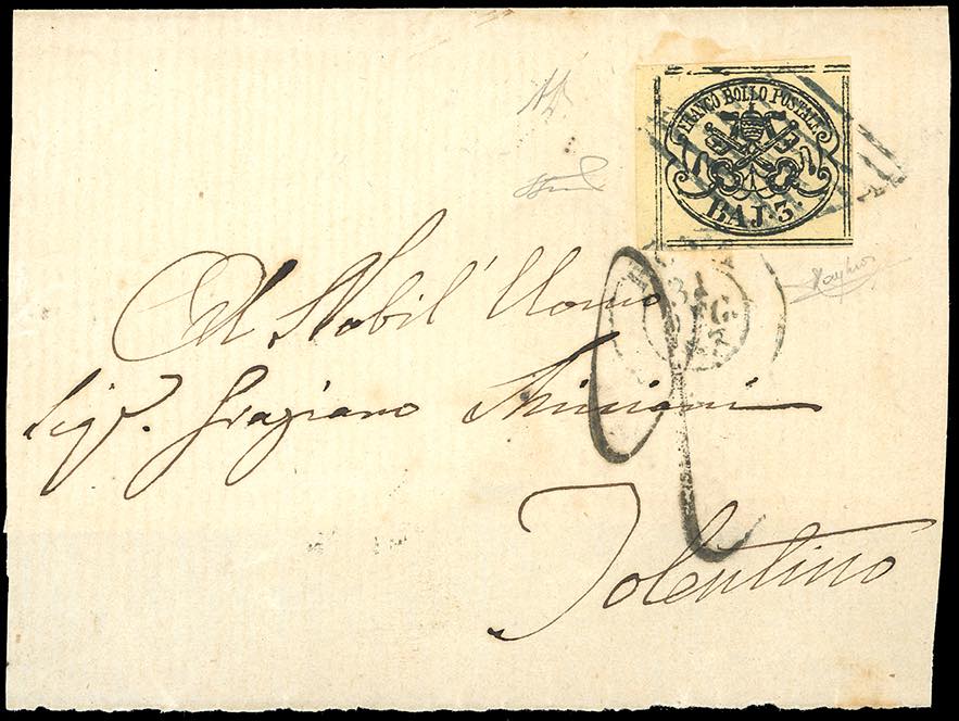 1863 - 3 baj giallo cromo (4A), otto filetti, bordo di foglio, perfetto, su lettera parzialmente incompleta al verso, da Roma 31/12/1863 a Tolentino, bollo di arrivo al verso. ULTIMO GIORNO DELLA TARIFFA DA 3 BAJ PER LE PROVINCE USURPATE, sostituita dal 1°gennaio 1864 da quella da 2 baj. Estremamente rara, per specialista. A.Diena, Raybaudi, Ferrario. (cat.Sassone € 10.000+ in proporzione per la sola tinta con otto filetti).