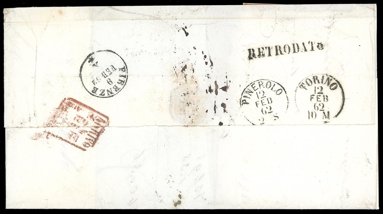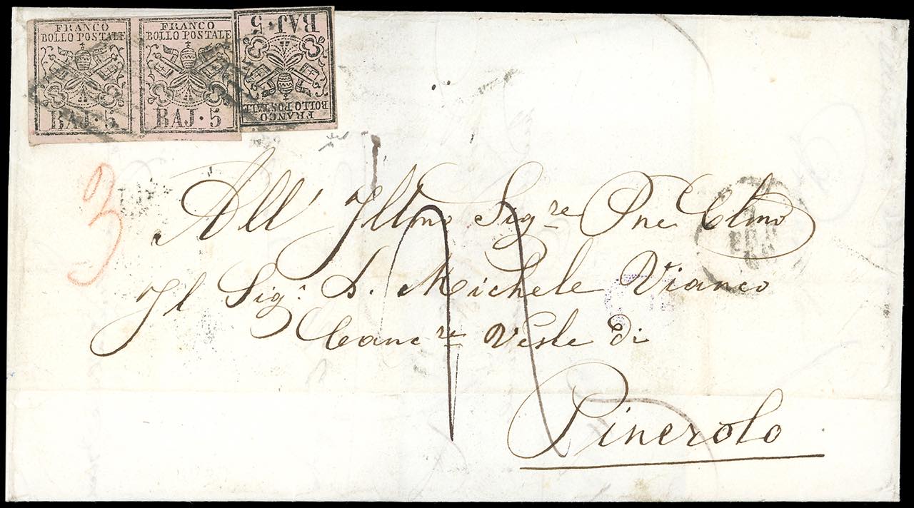 1862 - 5 baj rosa carminio (6A), coppia e singolo appartenenti a tirature differenti, ottimo stato, su lettera di tre porti da Roma 7/2/1862 a Pinerolo, tassata, al verso i bolli di transito e il lineare "retrodato". Interessante, sia per i valori gemelli che per il lineare al verso. Chiavarello.