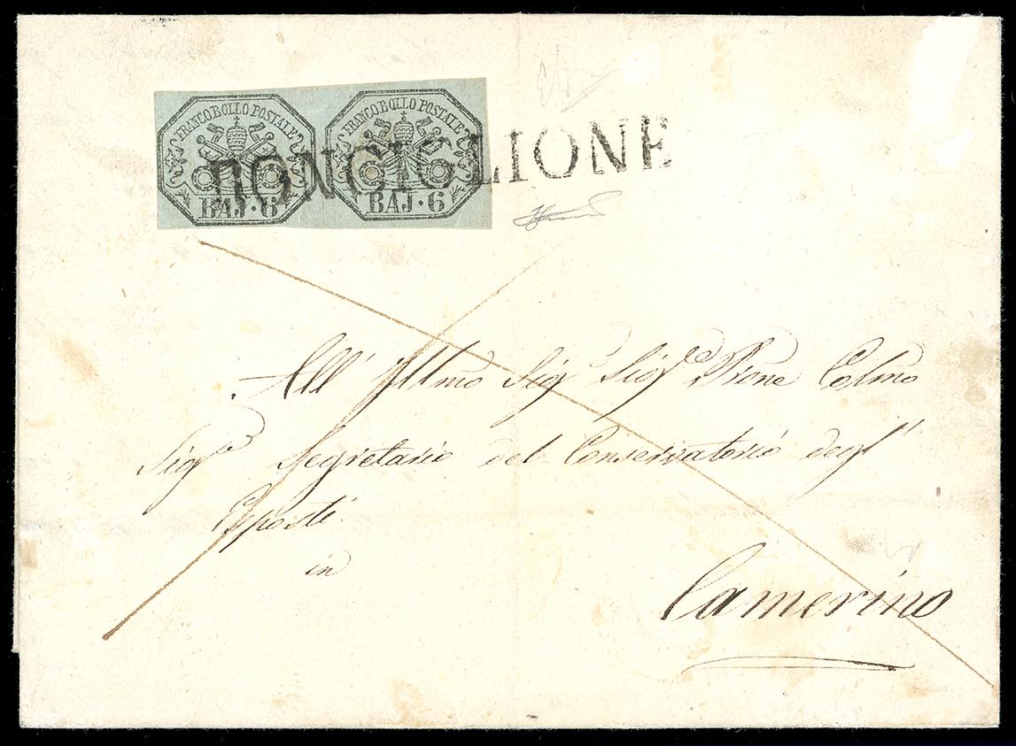 1854 - 6 baj grigio verdastro (7), coppia orizzontale, perfetta, su lettera di doppio porto da Ronciglione 12/10/1854 a Camerino. Rara, ... Leggi tutto