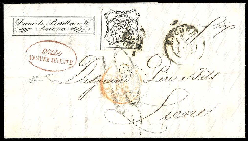 1853 - 8 baj bianco (9), su fresca lettera con intestazione a stampa "Daniele Beretta-Ancona" da Ancona 15/7/1853, francobollo annullato con il corsivo "Imp", a Lione, in Francia, con affrancatura insufficiente, ovale rosso "bollo insufficiente", e tassata 1 franco. Ottimo aspetto. Ferrario.