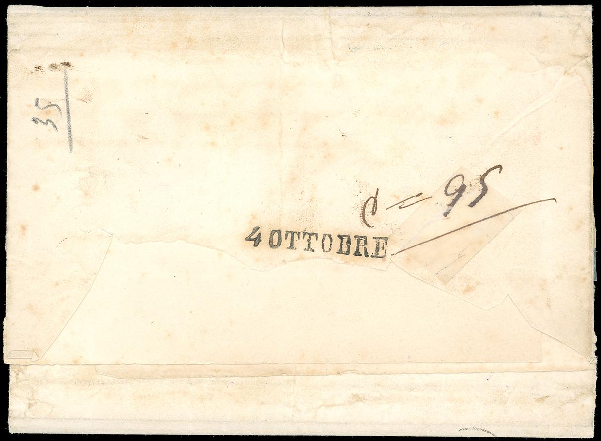 1855 - 8 baj bianco, undici esemplari, 7 baj azzurro (9,8), ottimo stato, su lettera assicurata di 21 porti, indirizzo asportato, da Ancona 3/10/1855 a Pesaro. Altissima affrancatura di 95 baj per l'interno, probabilmente unica. G.Oliva.