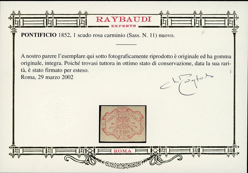 1852 - 1 scudo rosa carminio (11), nuovo, gomma originale integra, perfetto. A.Diena, Mezzadri, Ferrario, cert. Oro Raybaudi.