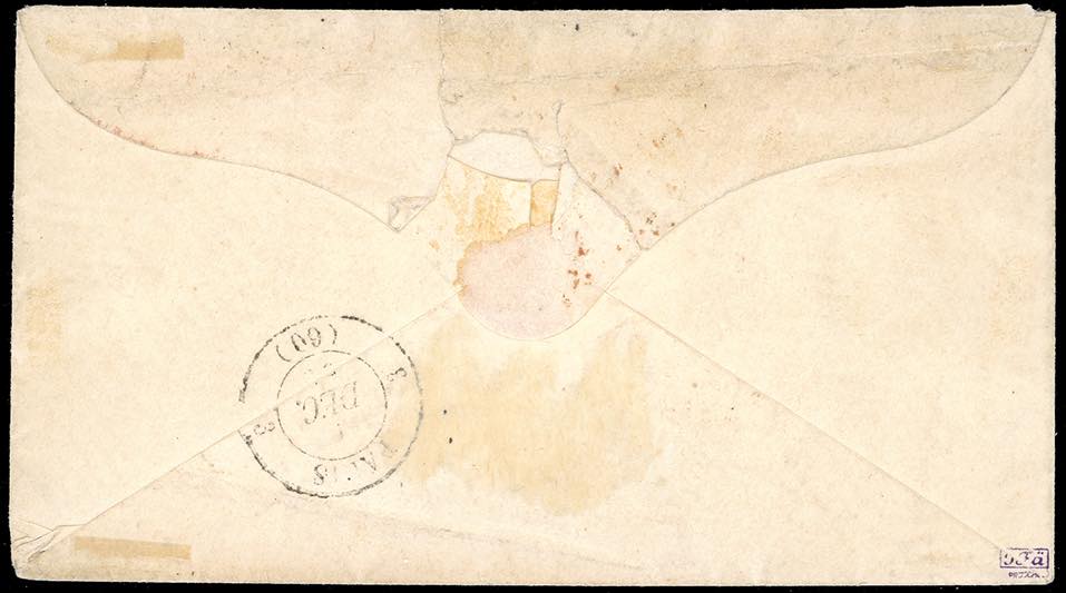1855 - 5 baj rosa, falso per posta del di Bologna, II tipo (F3), quattro esemplari con grandi margini, il primo a destra mostra in alto la linea nera della pietra litografica utilizzata per la stampa del falso (catalogato sul Sassone come "spazio tipografico"), su piccola busta da Bologna 25/11/1855 a Parigi. Insieme unico, PROBABILMENTE LA PIU' BELLA LETTERA CON I FALSI DELLO STATO PONTIFICIO. Pubblicata sul libro dello Stato Pontificio del Club di Montecarlo a pag. 195. A.Diena, Ferrario, cert. Enzo Diena.
