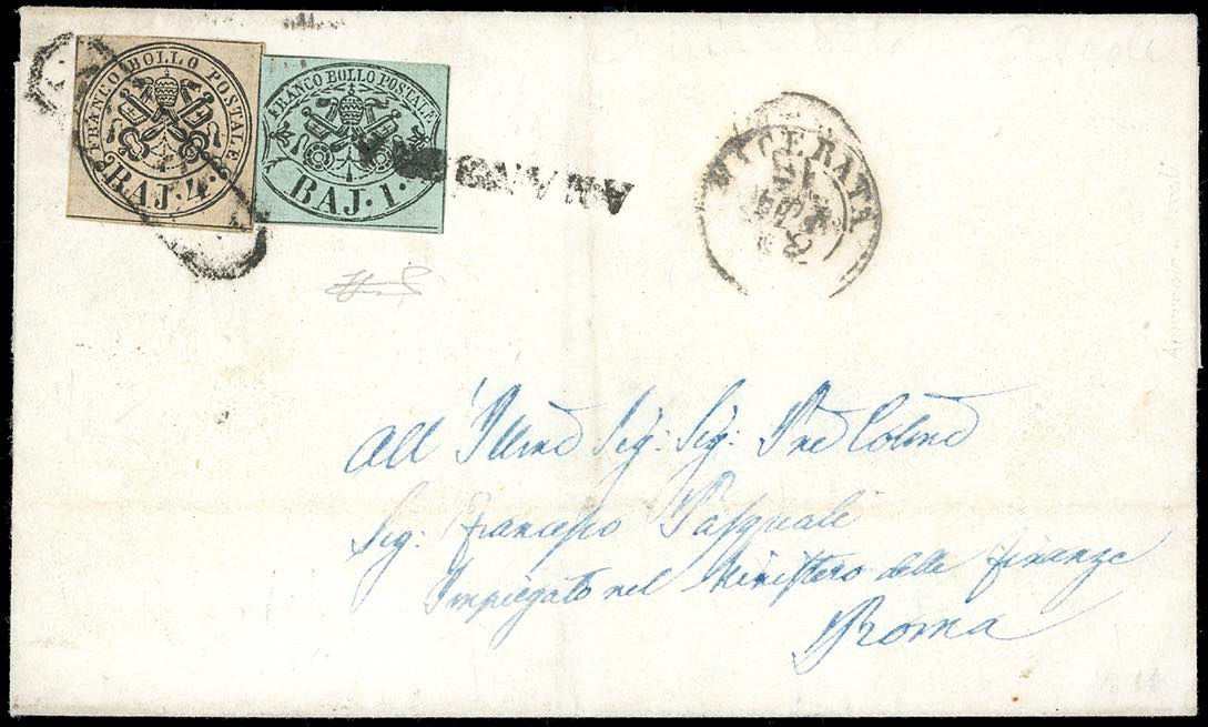 AMANDOLA, SD + ASCOLI, Cart. - 1 baj e 4 baj (2,5), perfetti, su lettera del 21/4/1852 per Roma. Il primo francobollo venne annullato con il lineare di Amandola, il secondo con l'ovale in cartella di Ascoli. Interessante e rara combinazione d'annulli non catalogata. Ferrario.